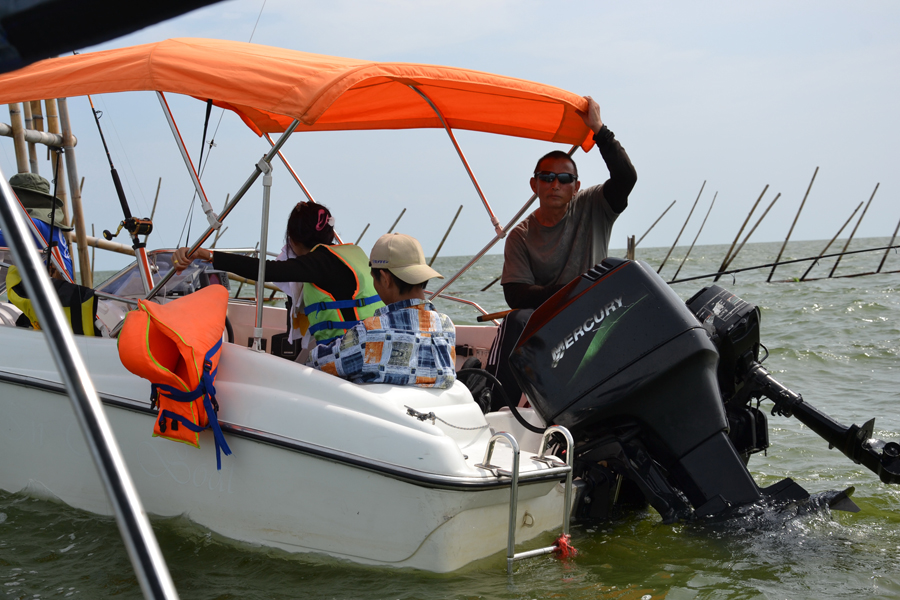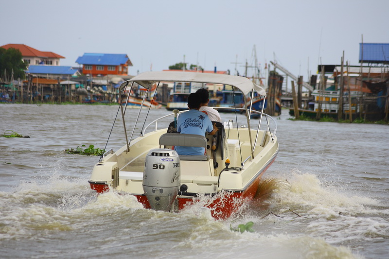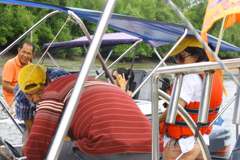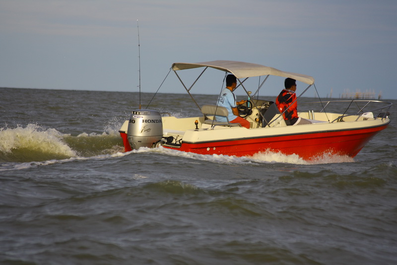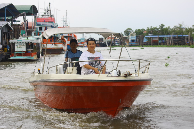 ขากลับเรือคนตราชูของพี่ภัคพงษ์ก็ตามมาสมทบอีก 1 ลำ วันนี้พวกเราตกลงกันว่าจะไปพักที่คุ้งน้ำรีสอร์ตอยู่ในคลองสุนัขหอน ต้องขับทะลุแม่น้ำท่าจีนออกไปก่อน โดยมีพี่ ๆ อีกหลายคนได้เดินทางโดยรถยนต์ล่วงหน้าไปรอพวกเราที่นั่นแล้ว.......ผมอาสาเป็นผู้นำฝูงเรือ เพราะน้ำในคลองลงมาก จะออกอ้อมทะเลก็มีคลื่นลมมากพอสมควร........ขณะที่ขับมายังไม่ถึงครึ่งทางของตอนมา ผมก็โดนอะไรไม่รู้เข้าให้ ใบพัดหายไปครึ่งใบ ....ในภาพนี้กำลังหยุดตรวจสภาพใบพัดและเติมน้ำมัน