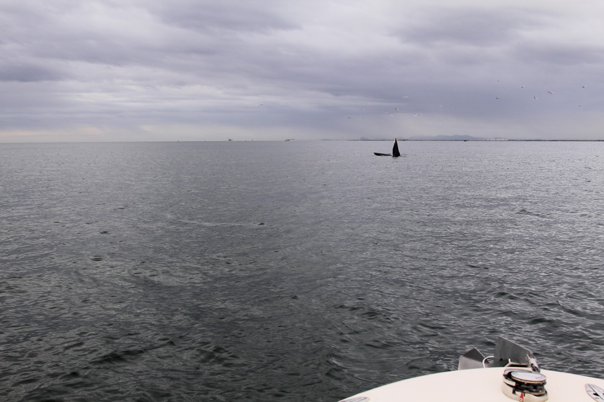 ออกจากร่องน้ำปากแม่น้ำมาได้ไม่ถึงสิบ กม ขับไป เอ๋ อะไรแวบๆ ข้างๆเรือหว่า เรือก็ไม่ใช่ เรือใบ ลมก็เงียบไม่น่ามี แต่พอเห็นปาก พะงาบๆ ก็รู้เลย พี่วาฬๆ