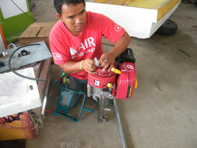 ทีมงานกัปตันเรือปูติดตั้งเรือหางยาวไปช่วยน้ำท่วม