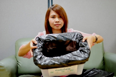 เมื่อเริ่มใช้ก็นำถุงมาสวมให้ทับด้านบน กันเปื้อนกล่องสำหรับความสะอาดของคนถัดไป