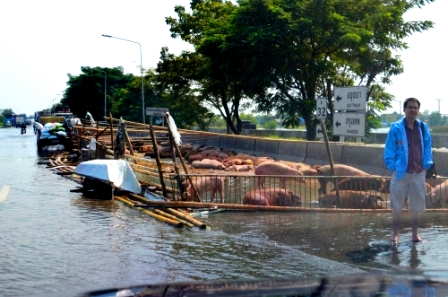 ผ่านแยกสระบุรีไปแล้ว มีชาวบ้านเอาหมู มาเลี้ยงบนถนนด้วย