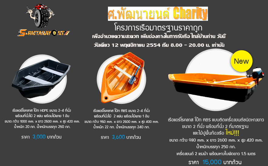 ศ.พัฒนายนต์ Charity ร่วมกับ Aeroklas ร่วมโครงการเรือมาตรฐานราคาถูก เพื่อผู้เดือดร้อนที่ประสบภัยน้ำท่วม และช่วยอำนวยความสะดวกให้กับผู้เดือดร้อนในบริเวณฝั่งธน และใกล้เคียง ในวันเสาร์ที่ 12 พฤศจิกายน 2554 วันนี้วันเดียวเท่านั้น (ขอสงวนสิทธิ์ผู้ที่ซื้อไปจำหน่ายต่อ)