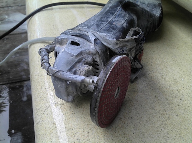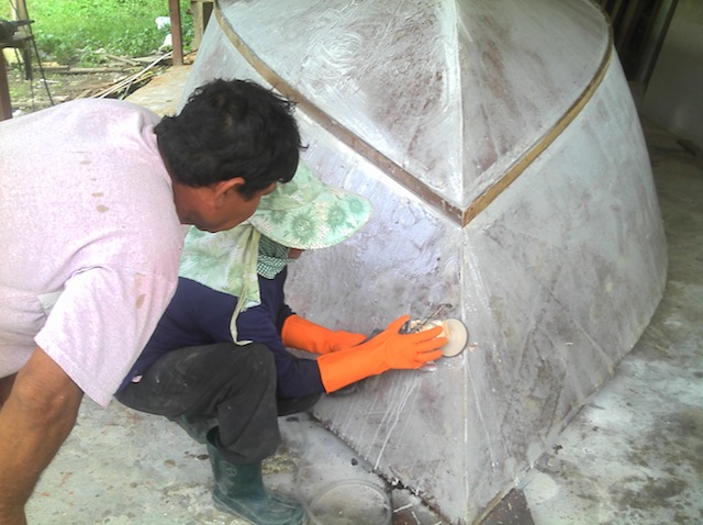 เครือบเรซิ่น +ใยสาน 1 เที่ยวโป๊วทัลคั่มแล้วก็ขัด ตอนขัดใช้เทคนิคและเครื่องมือสำหรับขัดเทอราซโซ่ หรือ หินขัดบ้าเราช่วยเร็วดีครับไม่เหนื่อยมากฝุ่นไม่มีเพราะเป็นระบบเปียก