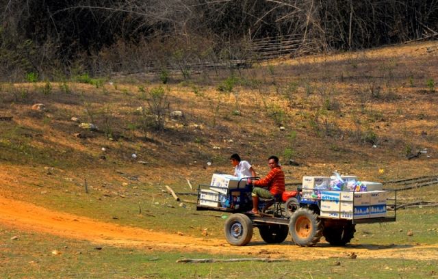 พาหนะดัดแปลงของชาวบ้านมาช่วยขน หลายกิโลจากท่าเรือไปโรงเรียน