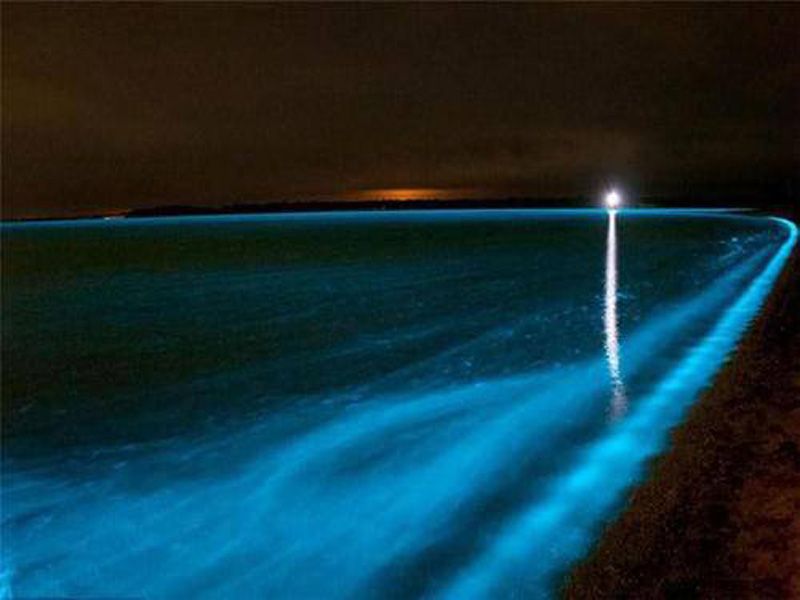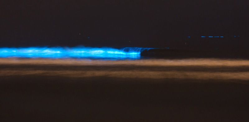 ปรากฏการณ์ทะเลเรืองแสง (Bioluminescent Sea) เราจะเห็นทะเลมีแสงสีน้ำเงิน หรือมีแสงสีเขียวอมฟ้า เมื่อมีคลื่นแตกฟอง แสงจะเกิดที่เกลียวคลื่น บางที่แสงก็กระจายตามพื้นทราย ตามก้อนหิน
