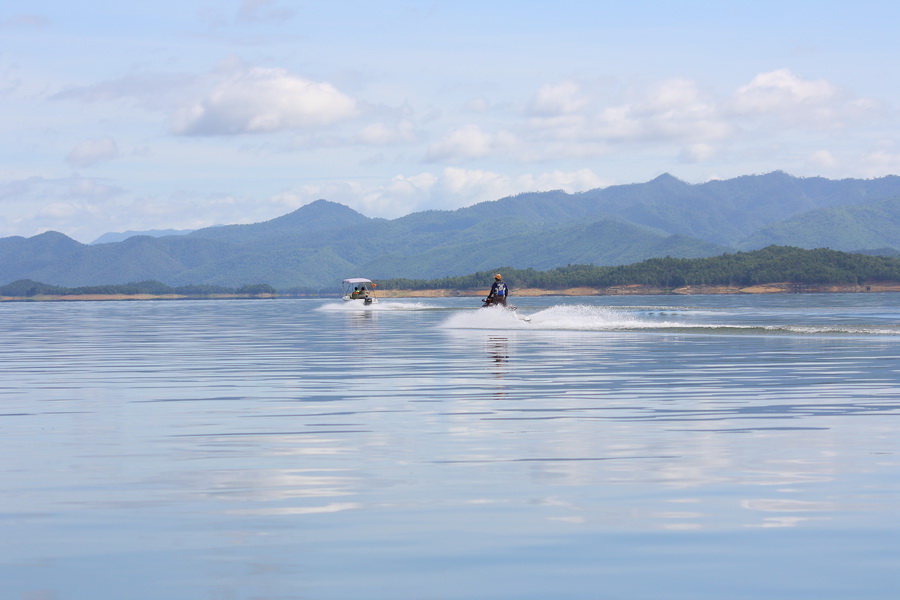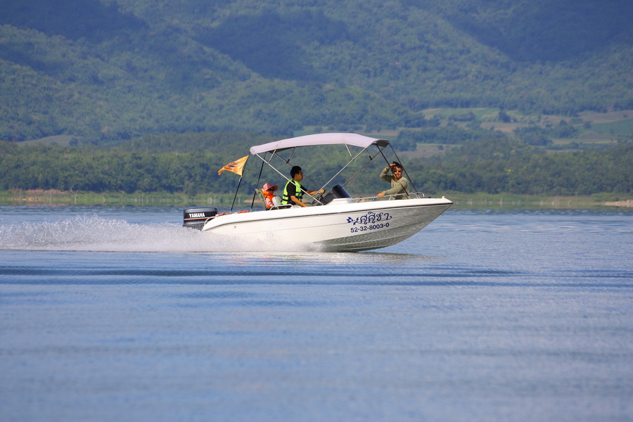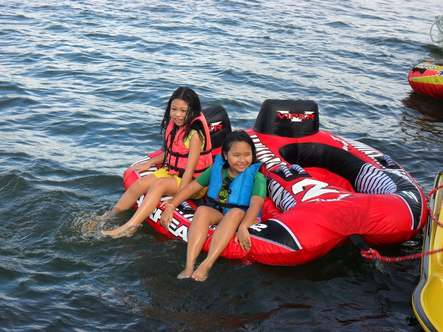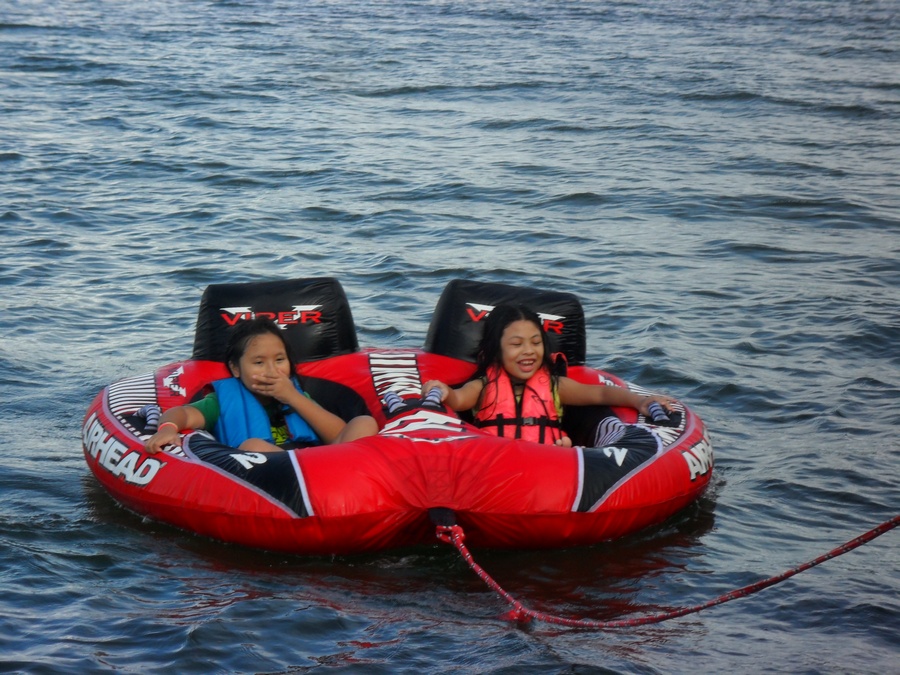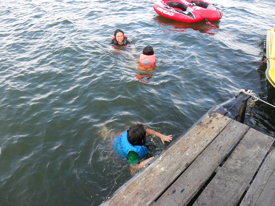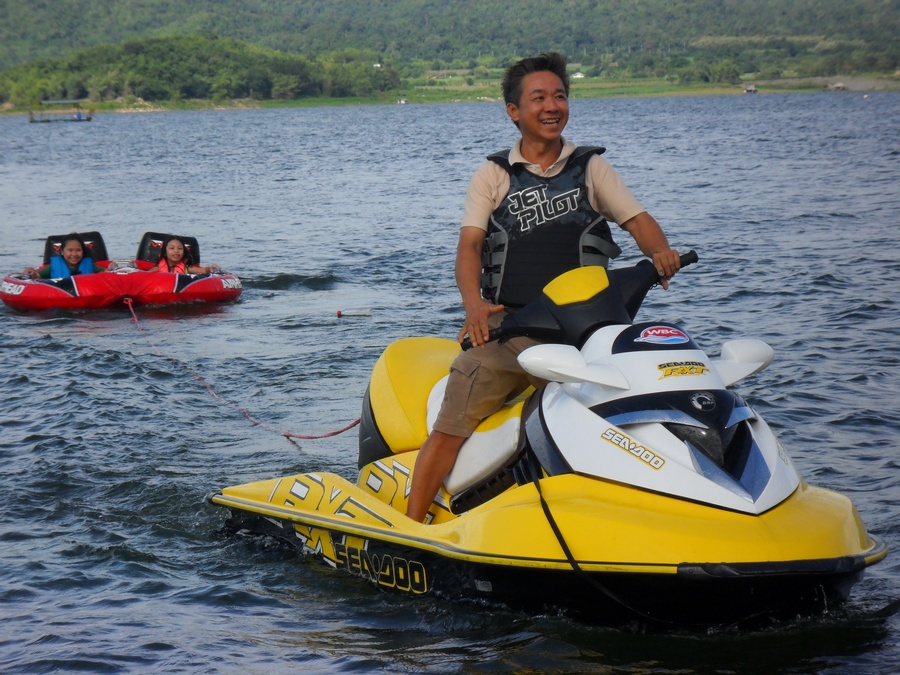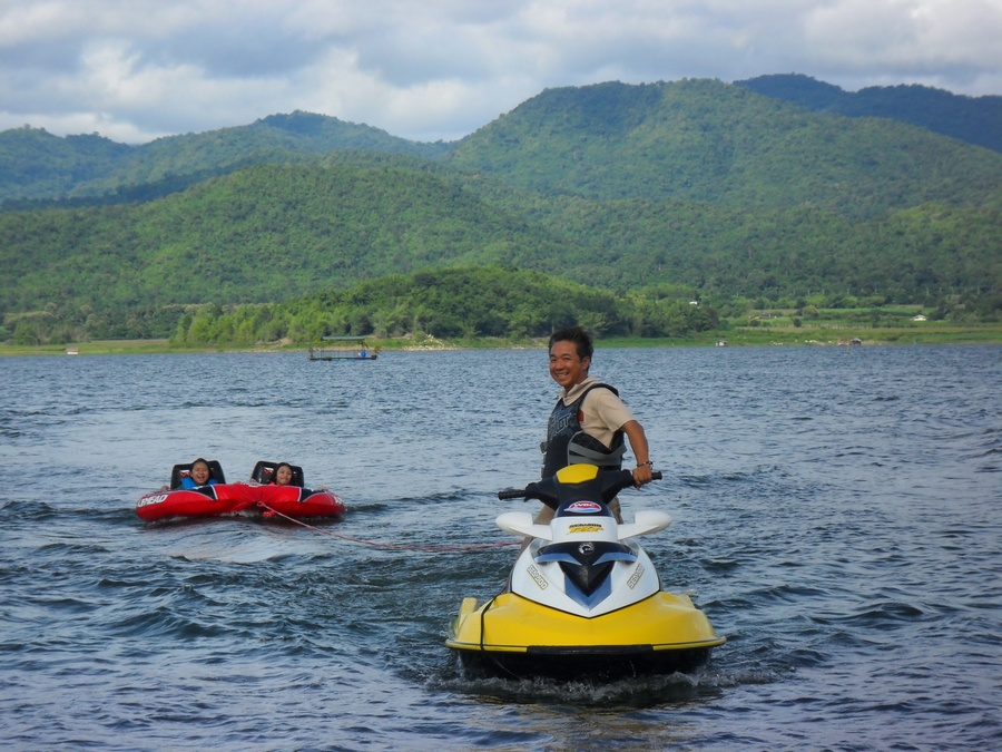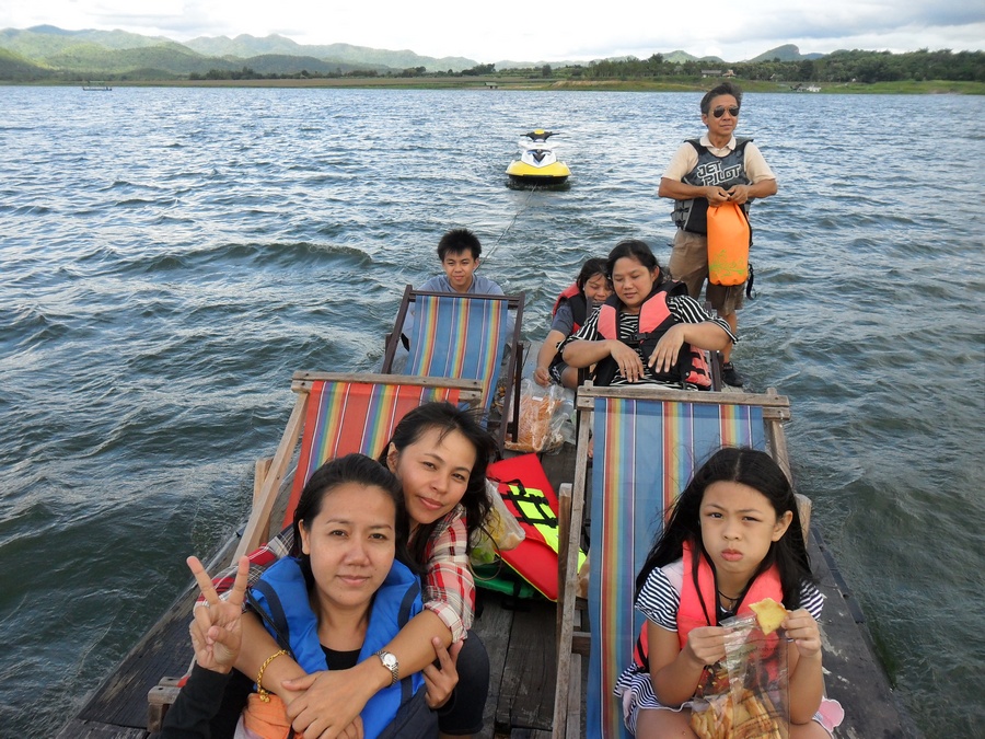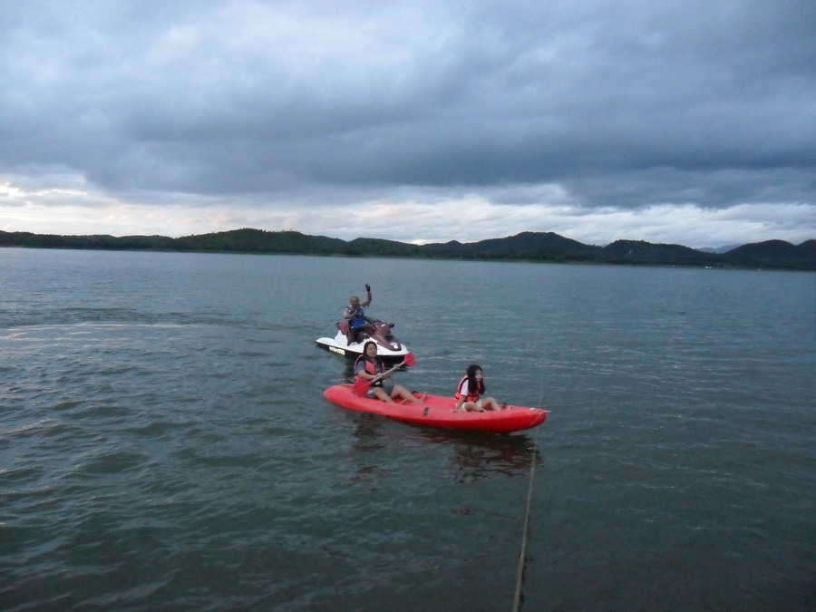 ที่หน้าแพ มีกิจกรรมทำตลอด ทั้งว่ายน้ำ เล่นเรือ พายเรือ ลากโดนัด ฯ