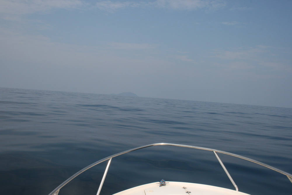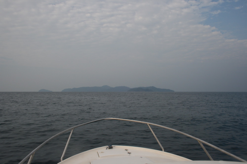 หลังจากเดินทางมาพักใหญ่ ผ่านเกาะบอนด้านขวามือ ภาพเกาะตาชัยก็ปรากฏลางๆ ด้านหัวเรือ