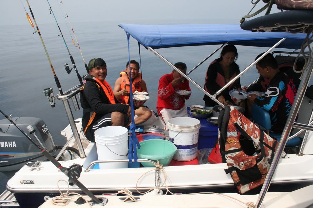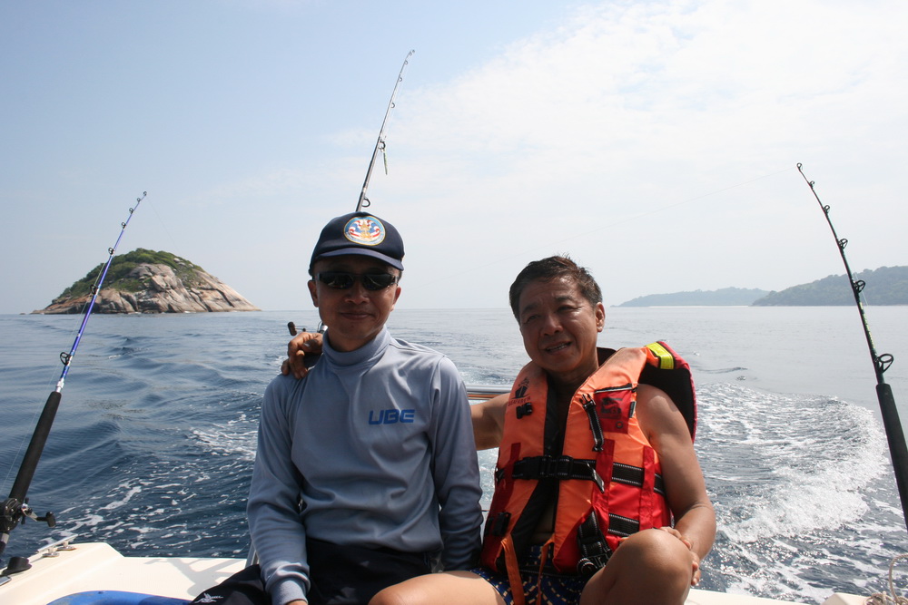 ตกบ่ายๆ น้าเจมส์ดอน รู้ข่าวว่าพวกเราตกปลาได้น้อยกลัวไม่พอทานเลยวิ่งเรือยางจากเรือใหญ่กลางทะเลเอาปลามาฝากเพิ่ม ก็ขอขอบคุณในน้ำใจครับ ทำพิธีส่งมอบเรียบร้อย ส่วนคนเสื้อแดงข้างหลัง อายครับ ยังตกปลาไม่ได้สักตัว