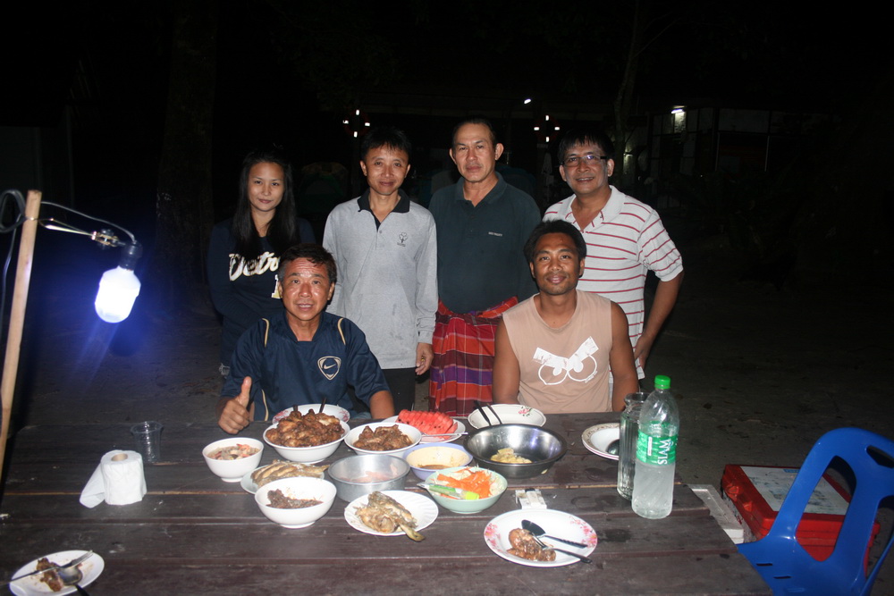 ตกเย็นคืนนั้นเราเลยมีอาหารมื้อใหญ่ที่สุดตั้งแต่ออกทริปมา ด้วยเมนูปลาดิบ ปลาทอด รวมทั้งเมนูไก่ทอด ไก่ต้มโค้ก ต้มยำกุ้งจากน้องบอย เจ้าหน้าที่อุทยาน ที่ดูแลอำนวยความสะดวกแก่คณะเราตั้งแต่ต้น น่ารักมากครับ โดยเฉพาะเมนูไก่ต้มโค้กนี่เด็ดขาดจริงๆ