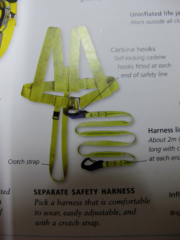 สายรัดกันตกรือ สวมไว้กับตัว ปลายสายอีกด้านมีที่เกี่ยว เกี่ยวกับสลิงหรือเส้นราวเชือกที่จะขึงกันตอนคลื่นลมแรงจัด เพื่อลูกเรือจะได้ปฎิบัติหน้าที่บนดาดฟ้าเรือได้อย่างปลอดภัย ไม่โดนคลื่นซัดตกทะเลไปเสียก่อน แล่นเรือกลางพายุบนดาดฟ้าต้องใช้ครับช่วยให้ปลอดภัยครับ