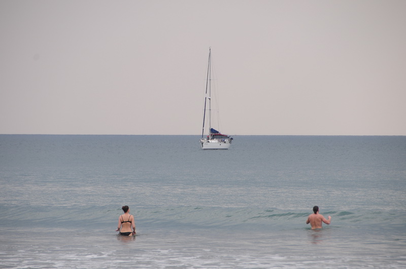 เย็นนี้ คลื่นแรง เดิมจะนำดิงกี้ขึ้นไปสำรวจหาด เจอคลื่นม้วนบริเวณริมหาด ถ้าพลาดดิงกี้พลิกไม่เสี่ยงครับ เปลี่ยนใจกลับมาเล่นน้ำท้ายเรือแทน ก่อนลงเล่นน้ำท้ายเรือ เราจะผูกเชือกทุ่นชูชีพทิ้งไว้หลังเรือเสมอ เพื่อความปลอดภัยจากกระแสน้ำแรง แม้แต่การเกิดตะคริวตอนเล่นน้ำก็ดี มีทุ่นชูชีพอยู่ใกล้ สิ่งนี้ควรปฏิบัติเป็นอย่างยิ่ง ทำแบบนี้อุ่นใจครับ
