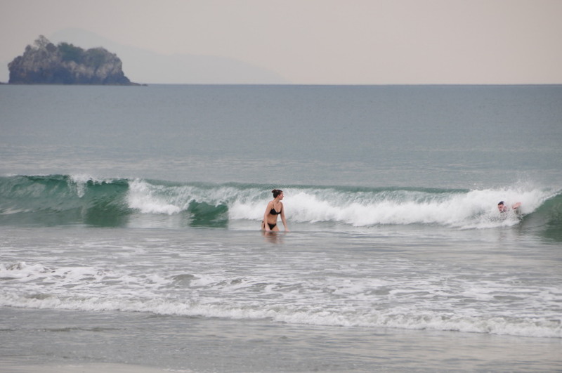 หาดอ่าวใหญ่ วันนี้คลื่นแรง ดิงกี้เข้าหาดค่อนข้างยาก เปียกปอนกันทั่วหน้า ทรายบนหาด ขาวปนดำ คลื่นจัดเรียงให้เห็นเป็นระลอก แลเหมือนทิวเขา เล่นน้ำ ดื่มกินที่ร้านอาหารริมหาด เจ้าของอัธยาศัยดี ถือโอกาสขอใช้ห้องอาบน้ำ
