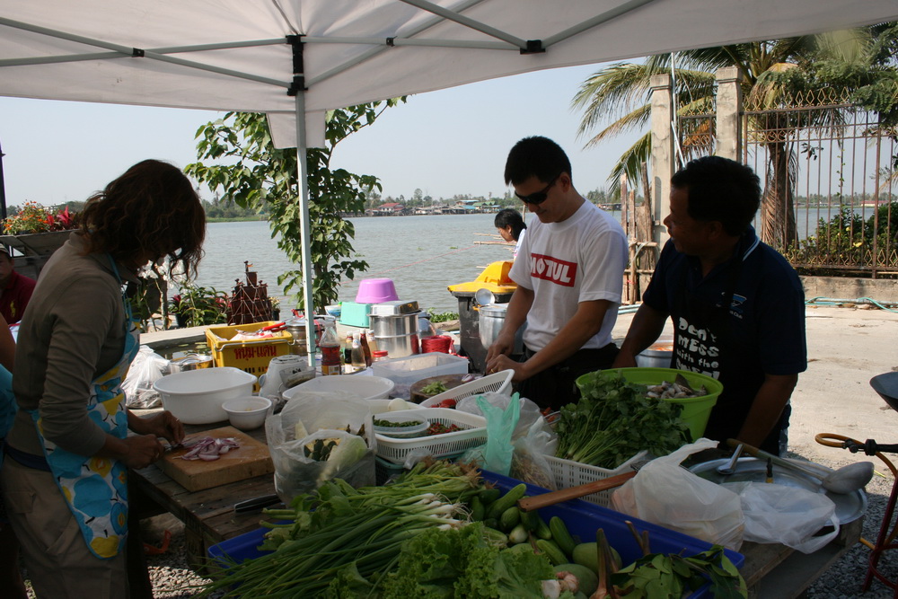 ทีมครัวกำลังเตรียมอาหารและกับแกล้มอย่างขมีขมัน น้าเก๋ น้าโอ และน้าเบญ