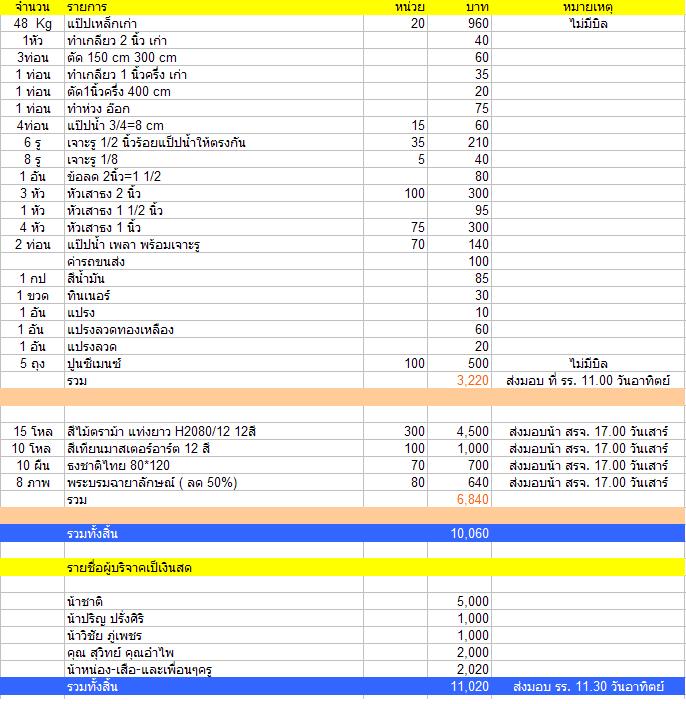 ตั้งงบใว้เบื้องต้นที่การทำเสาธงและอุปกรณ์ 5000 บาท และ ค่าเสื้อพละเด็กๆอีก 4000 บาท