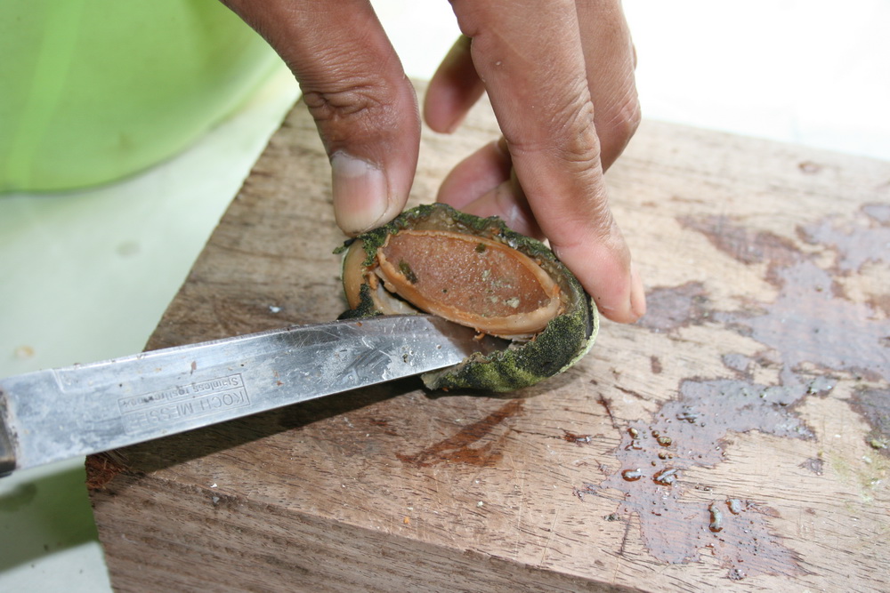 วิธิชิม ต่างจากหอยอื่นครับ หลังจากต้มแล้วก็ต้องใช้มีดช่วยครับ เลาะเอาเนื้อตรงกลางออกมาก่อน