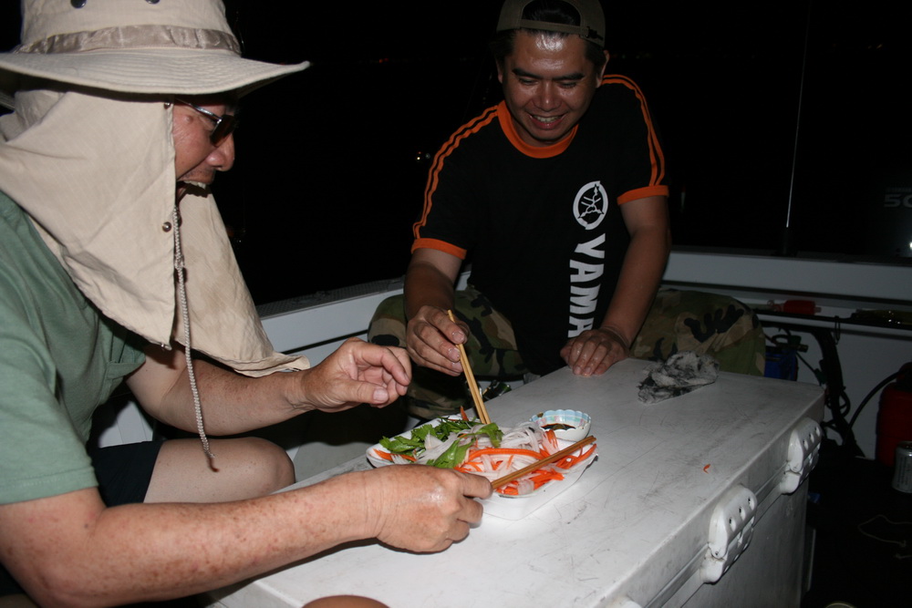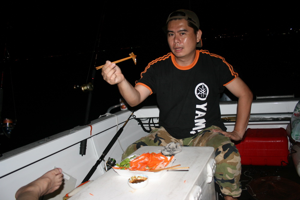 ตอนค่ำหลังจากเปิดไฟล่อหมึก ก็ได้มาหลายหน่วย ก่อนที่จะเอาไปเกี่ยวเป็นเหยื่อปลา ก็มาเป็นเหยื่อคนก่อนล่ะกัน