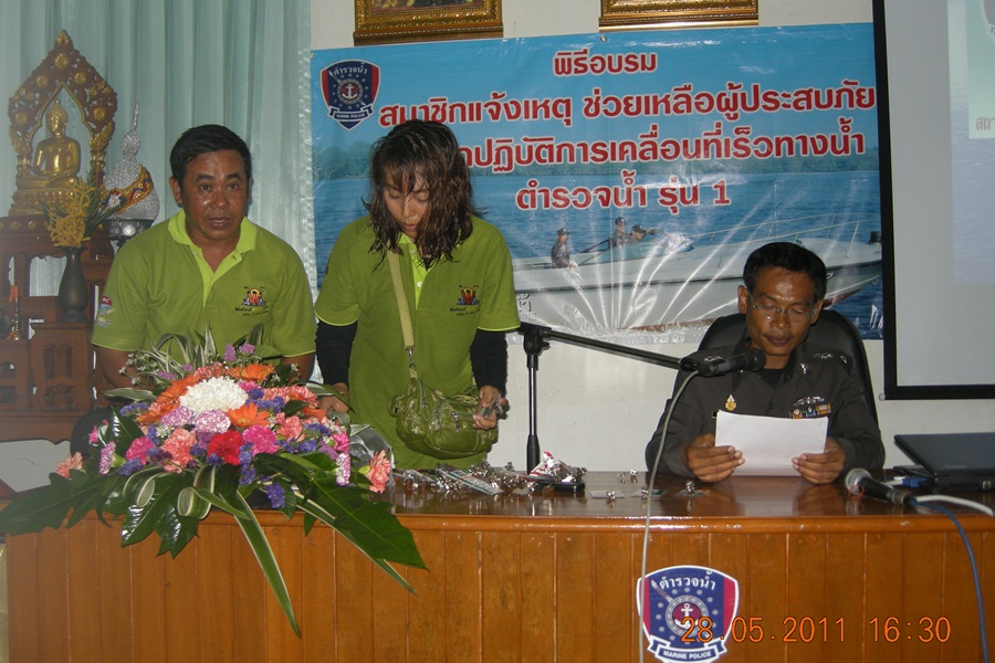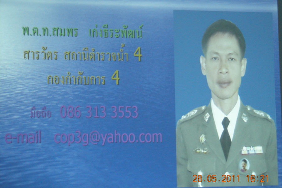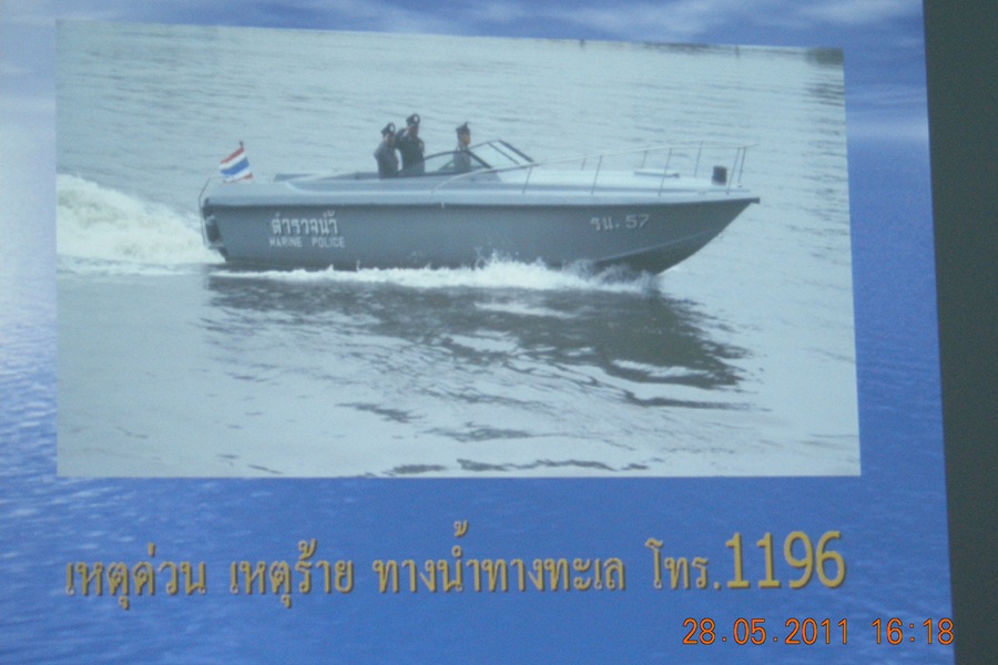 วันที่ 28 พฤษภาคม 2554 ระยะเวลา 1 วัน ที่ห้องประชุม สถานี ตำรวจน้ำ 4 กองกำกับการ 4 กองบังคับการตำรวจน้ำ ต.มหาชัย อ.เมือง จ.สมุทรสาคร (ติดแม่น้ำท่าจีน)