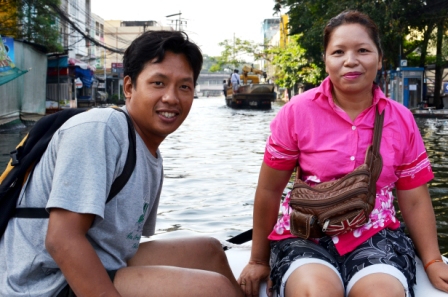 พ้นเมืองทองนิเวศน์ เข้าใกล้ Big C น้ำตื้นหน่อย คึกคักด้วยเรือรับจ้าง ถึงขนาดตั้งโต๊ะกลางถนนจับลูกค้าเลย