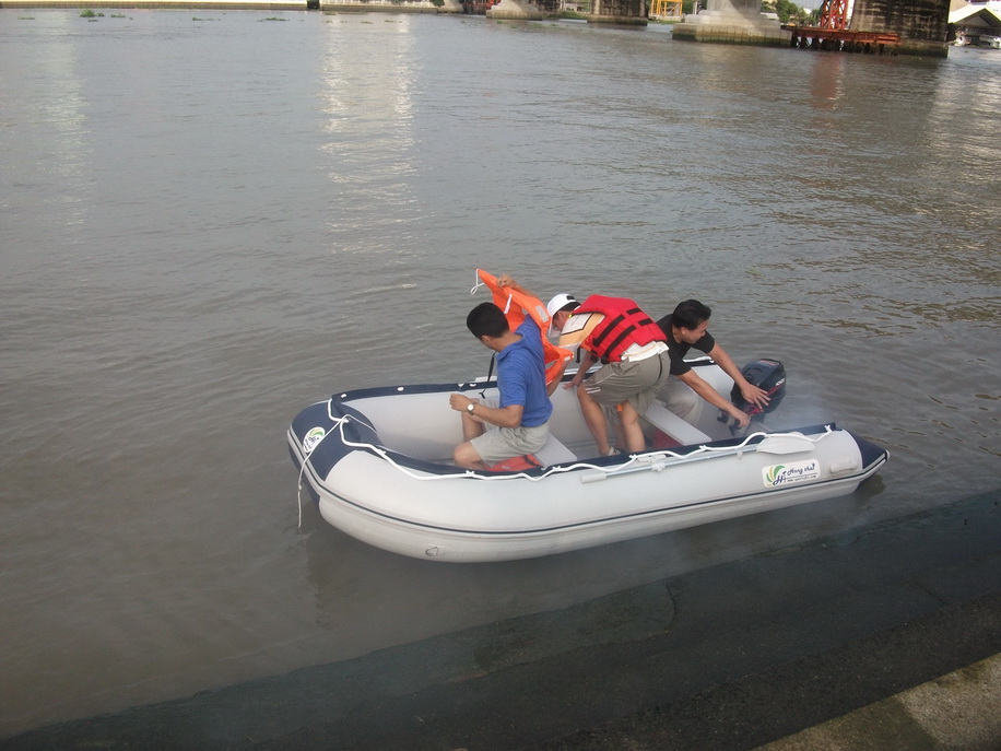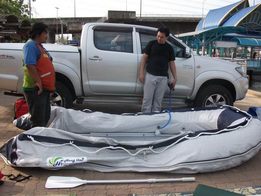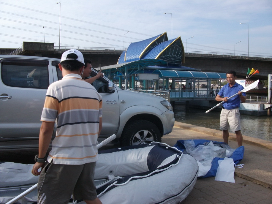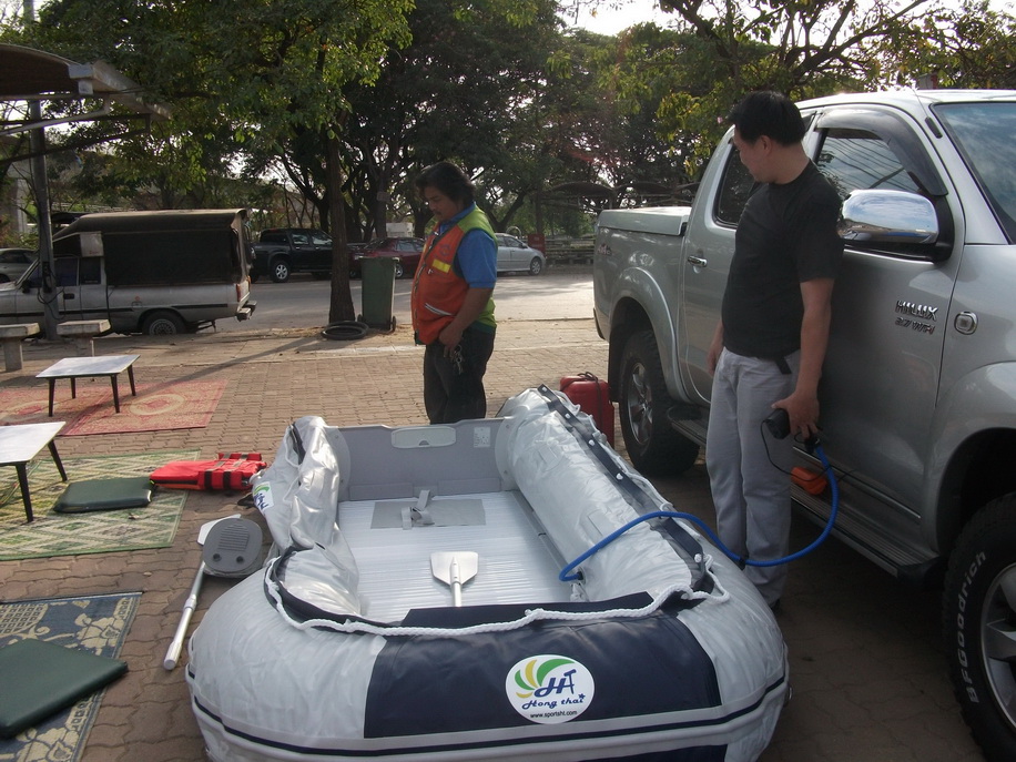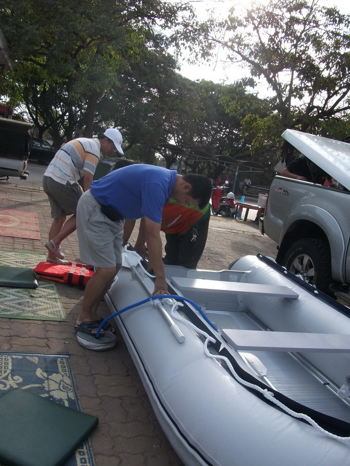 เริ่มต้นจาก สามคนช่วยกันประกอบและเติมลมเรือ ใช้เวลาประมาณ 30 นาที ที่ช้าเพราะตัดสินใจกันไม่ถูกว่าจะใช้เรือผมหรือเรือคุณยศดี พอสรุปได้ว่าเอาเรือผม ก็ตกลงกันต่อว่า เอาเครื่องน้าตูนหรือเครื่องคุณยศดี ฮ่าๆๆ ยังไม่จบนะ น้าตูนกะคุณยศ ยังตกลงกันอีกว่าเอาถังน้ำมันใครจะเหมาะกว่า