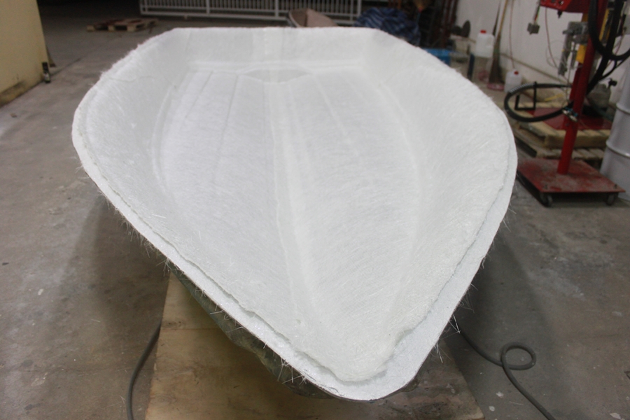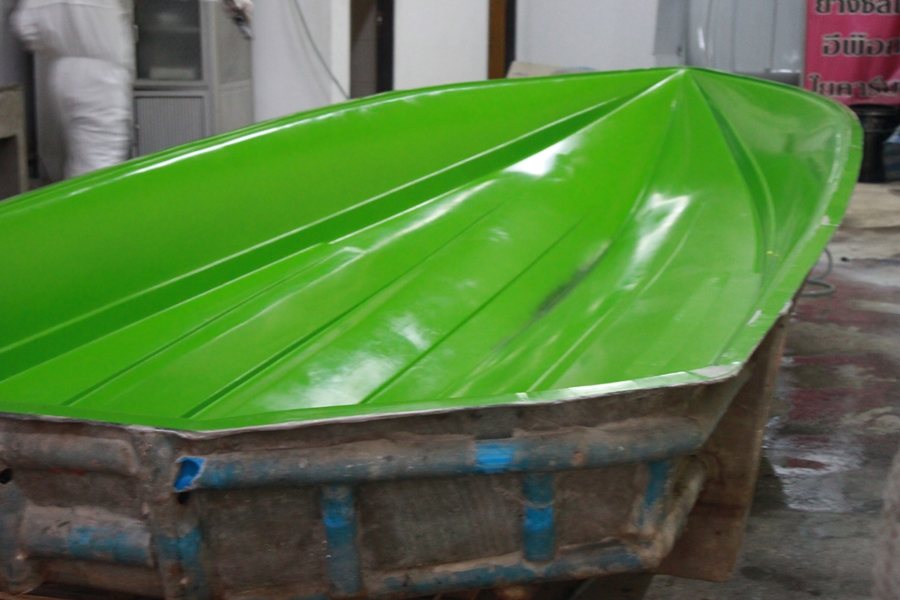 ภาพอีกมุมนึงจากด้านหัวเรือครับ สังเกตว่า รีดใยแก้ว CCM เข้าซอก มุม และลายริ้วของท้องเรือได้เรียบร้อยครับ