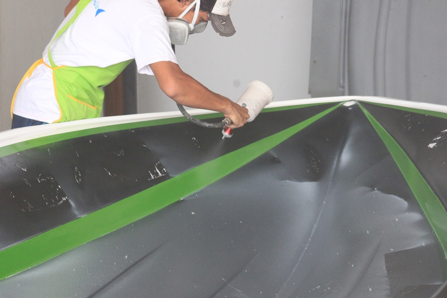 ขั้นตอนการทำชั้นเจลโค้ทครับ ท้องเรือลำนี้มีลาย 3 สี ลงมือโดยคุณพี เจ้าของอู่ต่อเรือ Bass Boat ที่กรุณาให้ทางทีมงานยืมแม่พิมพ์สำหรับการสาธิต และยังช่วยลงมือทำผิวเจลโค้ทให้อีกด้วย