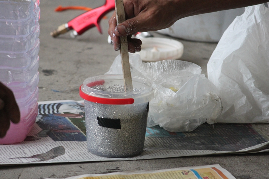 ลงมือพ่นเจลโค้ทใสผสมกากเพชร เดี๋ยวตอนแกะออกจากแม่พิมพ์เราจะได้เห็นผิวสวยๆครับ