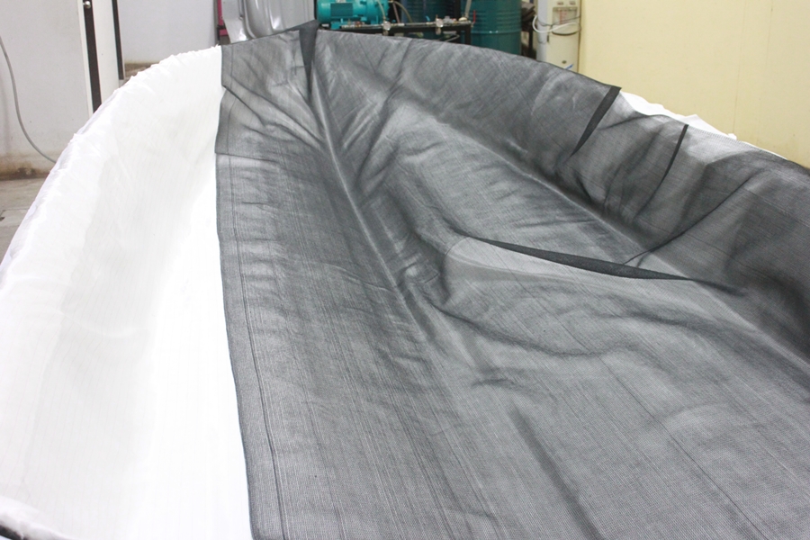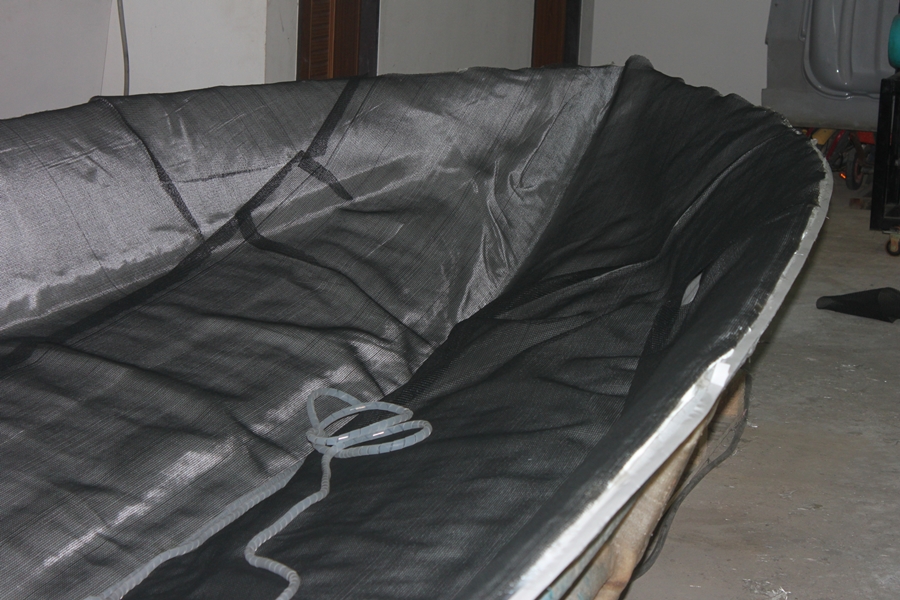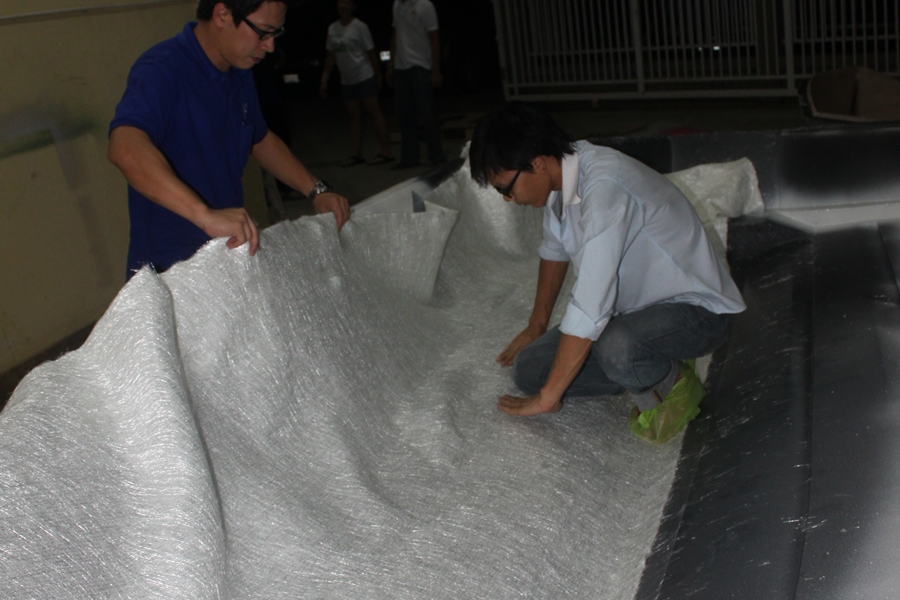 เริ่มต้นชั้นแรกด้วยปูใยแก้ว CCM (Core Combination Mat) ใยแก้วพิเศษสำหรับงานระบบฉีด ลักษณะเป็นใยแก้วผืนที่เราเห็นทั่วไปๆ ถูกเย็บติดกันสองแผ่น ตรงกลางจากมีส่วนของ Core คล้ายๆกับใยตาสาน แต่จะวิ่งทิศทางเดียวจากหัวเรือมาท้ายเรือครับ ข้อดีของใยแก้วชนิดนี้คือ ซึมเรซินได้ดีมากและมีอัตราการไหลของเรซิน (Flow Rate)สูงมาก
