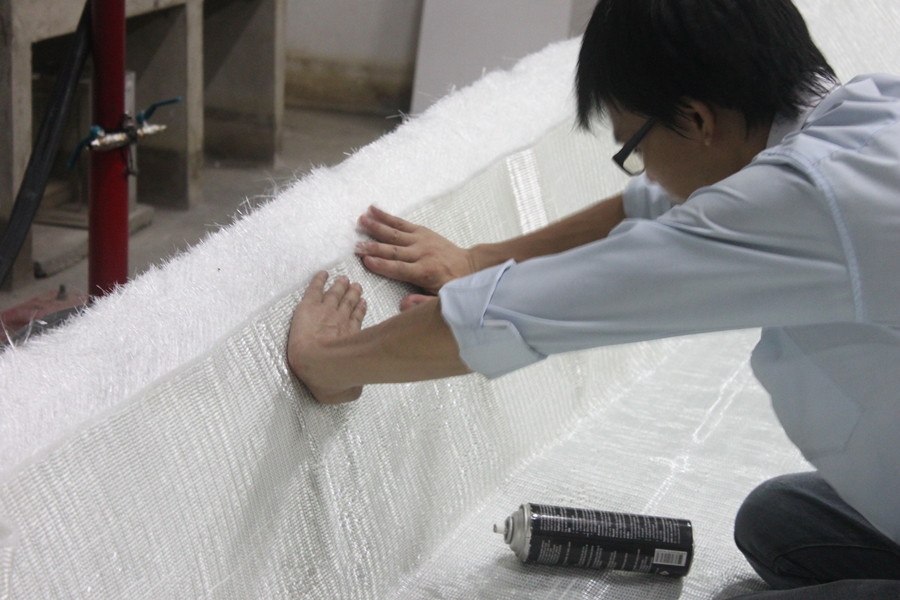 อันนี้เทคนิคเวลาปูใยแก้วแนวตั้งแล้วใยล้ม เราใช้กาวสเปรย์ช่วยได้ครับ ไม่มีผลต่อตัวชิ้นงานครับ