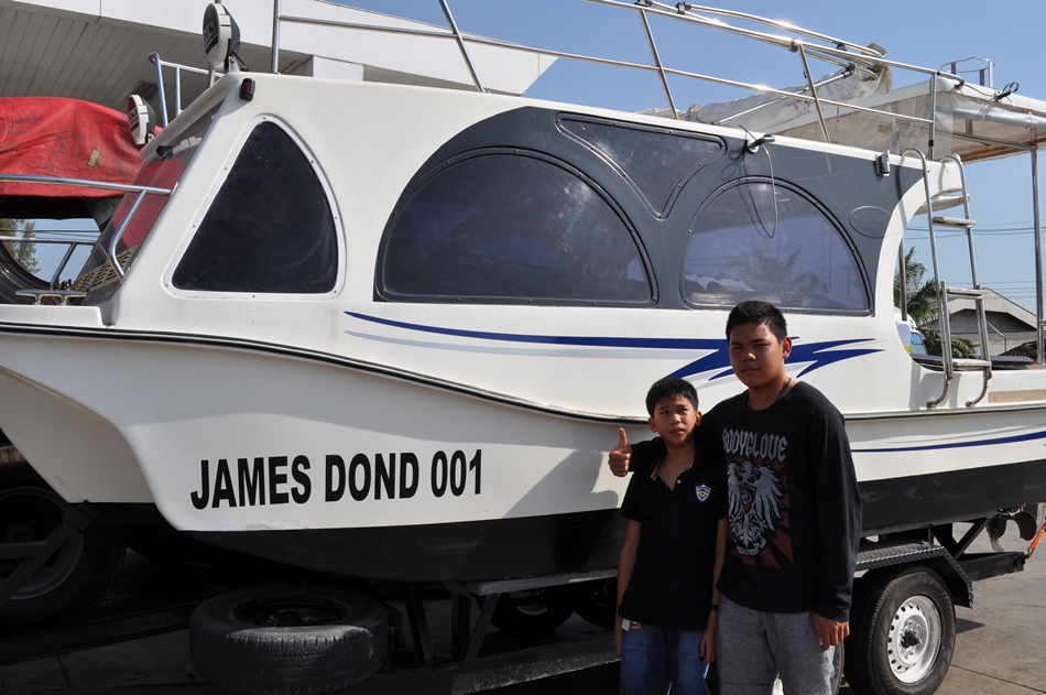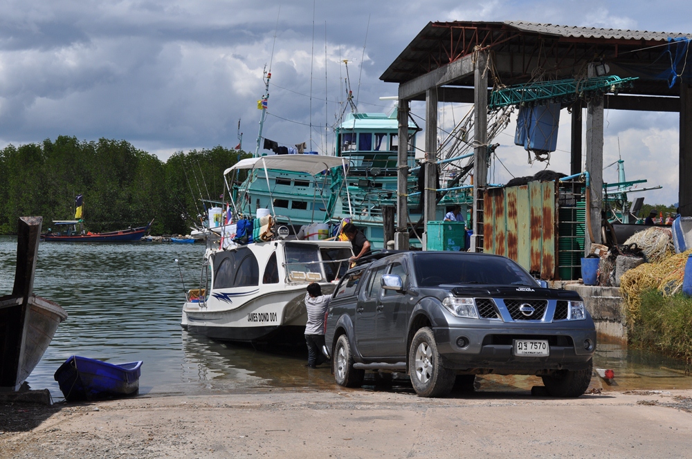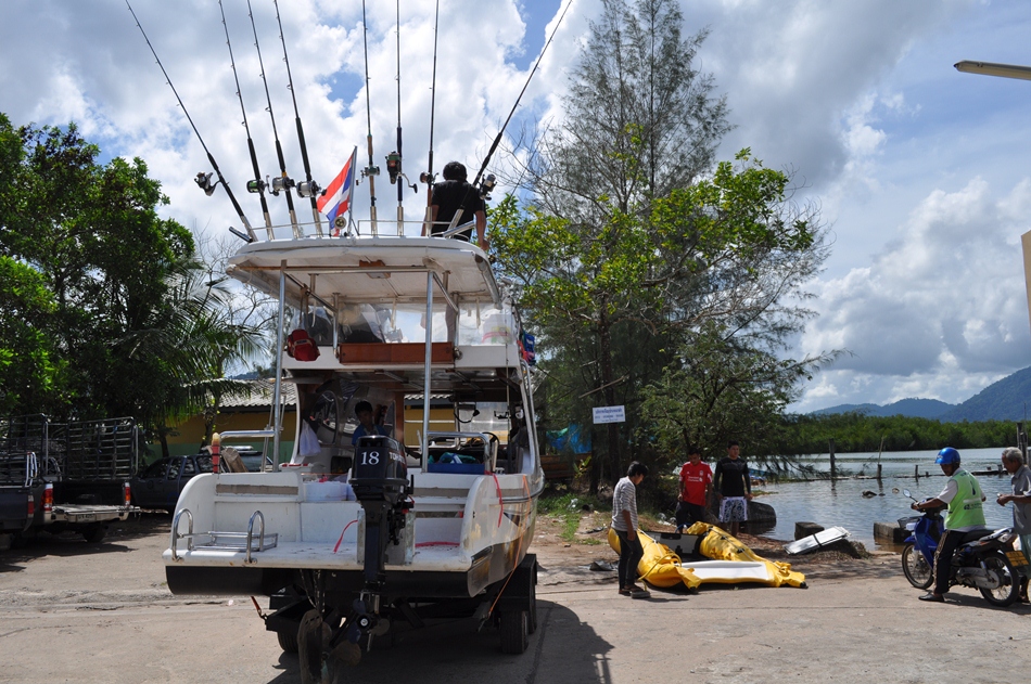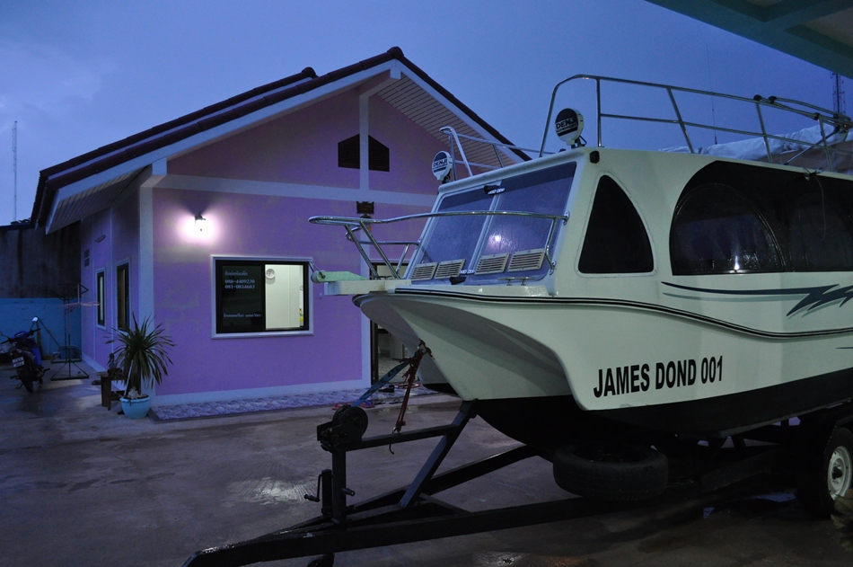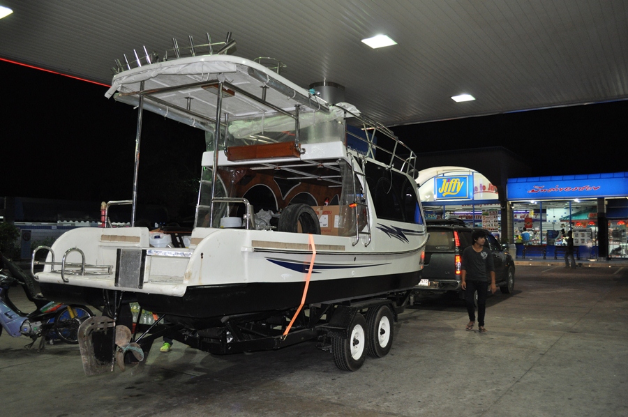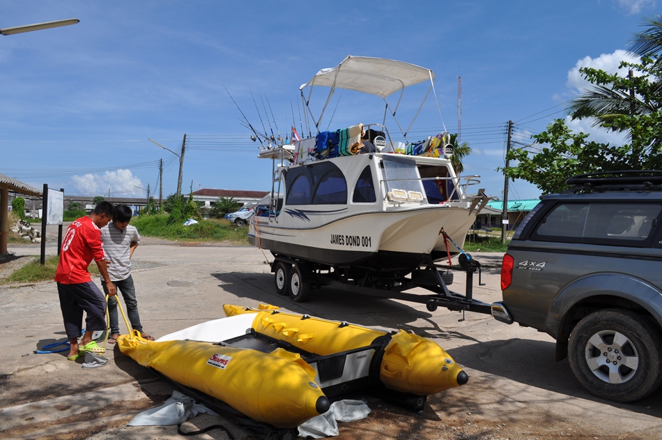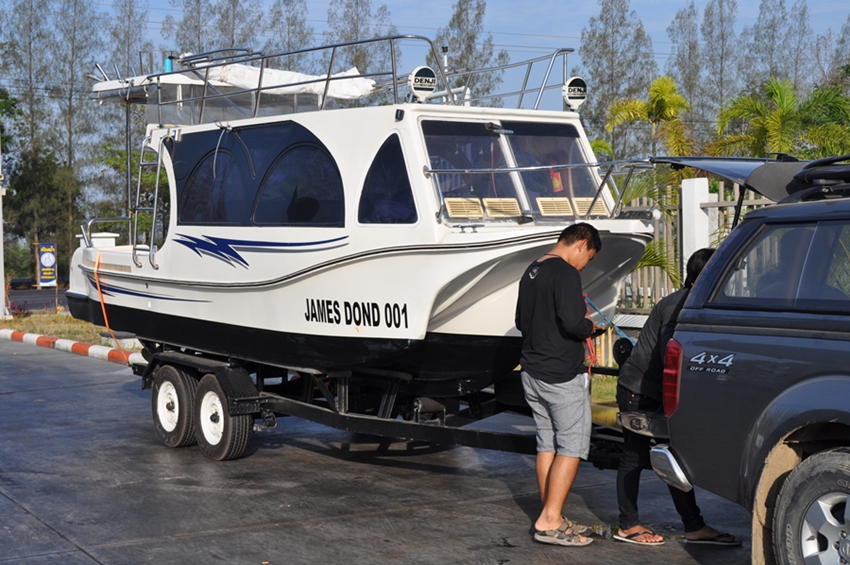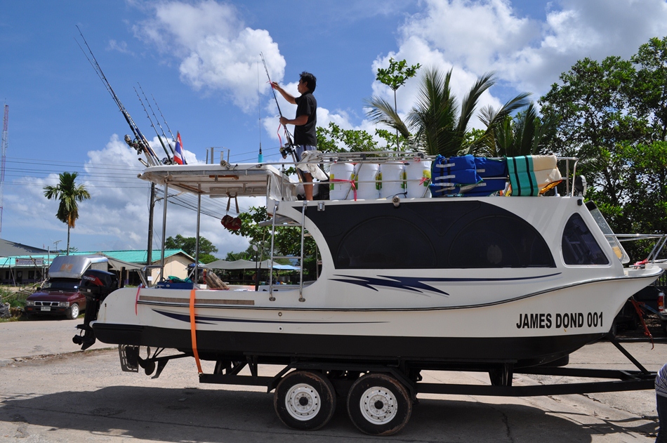 เรือกำลังแล่นสู่ปากอ่าว ด้วยน้ำหนักบรรทุกกว่า1,200-1,400ก.ก เฉพาะน้ำแข็งในถัง4ใบ แบ่งเป็น100คว็อท2ใบ..150คว็อท1ใบ และถัง300ลิตรอีก1ใบ ก็ปาเข้าไปกว่าครึ่งตัน! น้ำมันดีเซลล์170ลิตร น้ำมันเบ็นซิน60ลิตร น้ำจืด3ถัง60ลิตร น้ำดื่มขวดอีก4โหล เครื่องปั่นไฟ2200w.อีก1เครือง ข้าวสารอาหารแห้ง อาหารกระป๋อง อุปกรณ์ตกปลาและตะกั่ว(ทำเองด้วยท่อพีวีซีและซีเมนต์)น้ำหนักอีกเกือบ100ก.ก. และอื่นๆอีกมากมาย แต่ถ้ารวมน้ำหนักผู้โดยสาร6คนเข้าไปอีกเกือบ400ก.ก น้ำหนักบรรทุกเกือบสองตันบนเรือjames dond001..แถมต้องลากเรือยางเหลืองอีก1ลำ แต่เรือก็สามารถทำความเร็วได้ถึง10กม./ชม.!!!