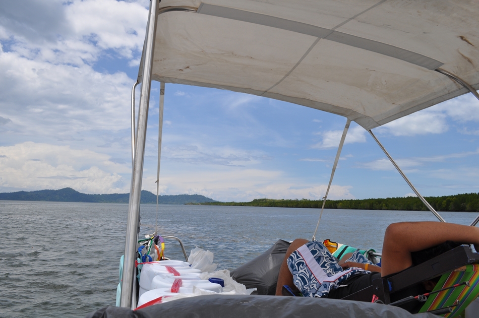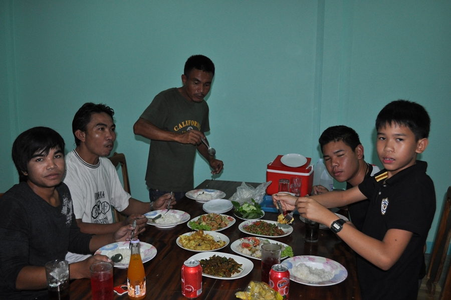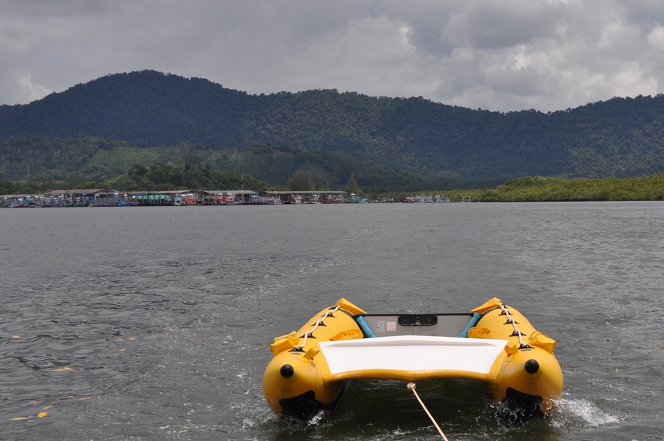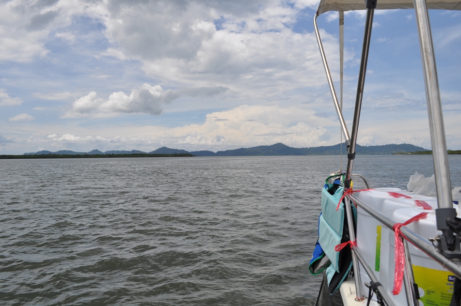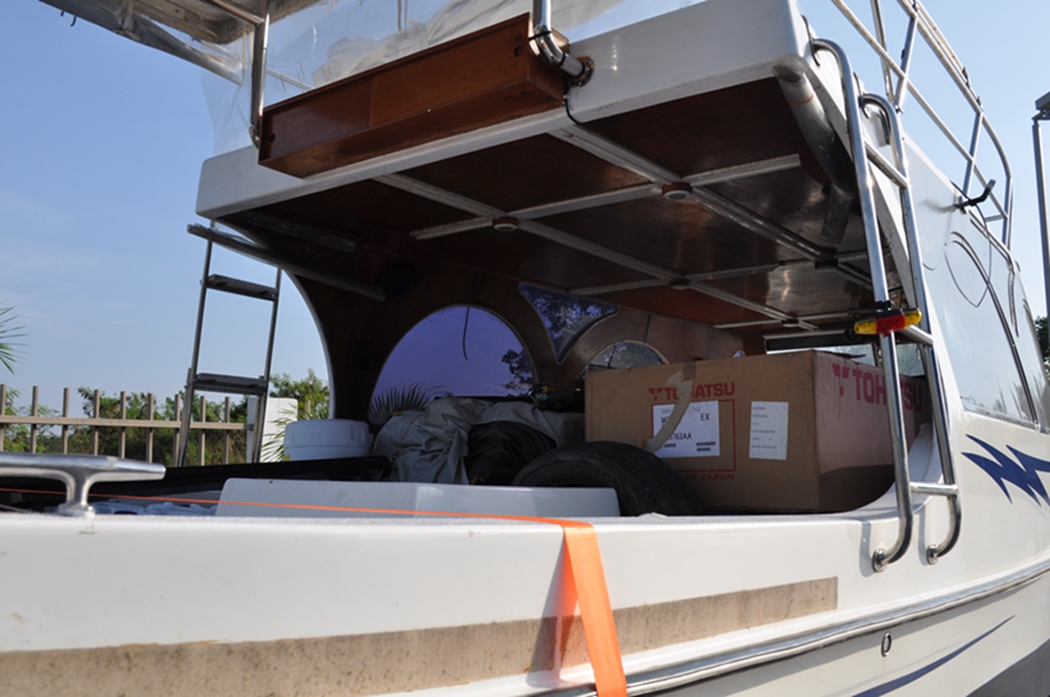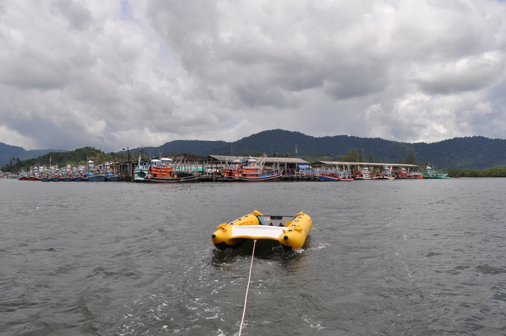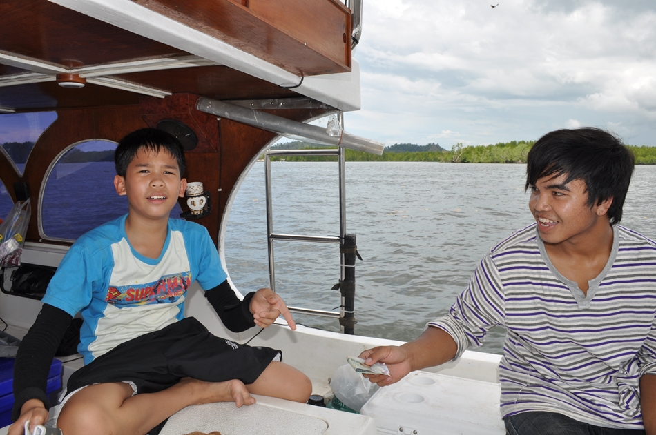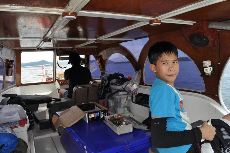 เรือกำลังแล่นสู่ปากอ่าว ด้วยน้ำหนักบรรทุกกว่า1,200-1,400ก.ก เฉพาะน้ำแข็งในถัง4ใบ แบ่งเป็น100คว็อท2ใบ..150คว็อท1ใบ และถัง300ลิตรอีก1ใบ ก็ปาเข้าไปกว่าครึ่งตัน! น้ำมันดีเซลล์170ลิตร น้ำมันเบ็นซิน60ลิตร น้ำจืด3ถัง60ลิตร น้ำดื่มขวดอีก4โหล เครื่องปั่นไฟ2200w.อีก1เครือง ข้าวสารอาหารแห้ง อาหารกระป๋อง อุปกรณ์ตกปลาและตะกั่ว(ทำเองด้วยท่อพีวีซีและซีเมนต์)น้ำหนักอีกเกือบ100ก.ก. และอื่นๆอีกมากมาย แต่ถ้ารวมน้ำหนักผู้โดยสาร6คนเข้าไปอีกเกือบ400ก.ก น้ำหนักบรรทุกเกือบสองตันบนเรือjames dond001..แถมต้องลากเรือยางเหลืองอีก1ลำ แต่เรือก็สามารถทำความเร็วได้ถึง10กม./ชม.!!!