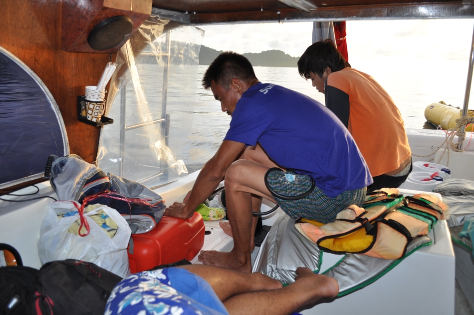 หลังจากตรวจดูสภาพภายนอก จะสังเกตุเห็นหัวเรือจมน้ำลงไปมาก นี่ขนาดปิดร่องที่ท้องเรือแล้ว คงเป็นเพราะน้ำหนักบรรทุกเกือบ2ตันนี่เอง