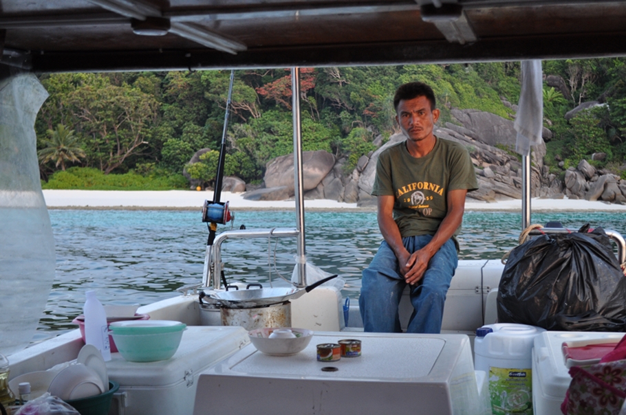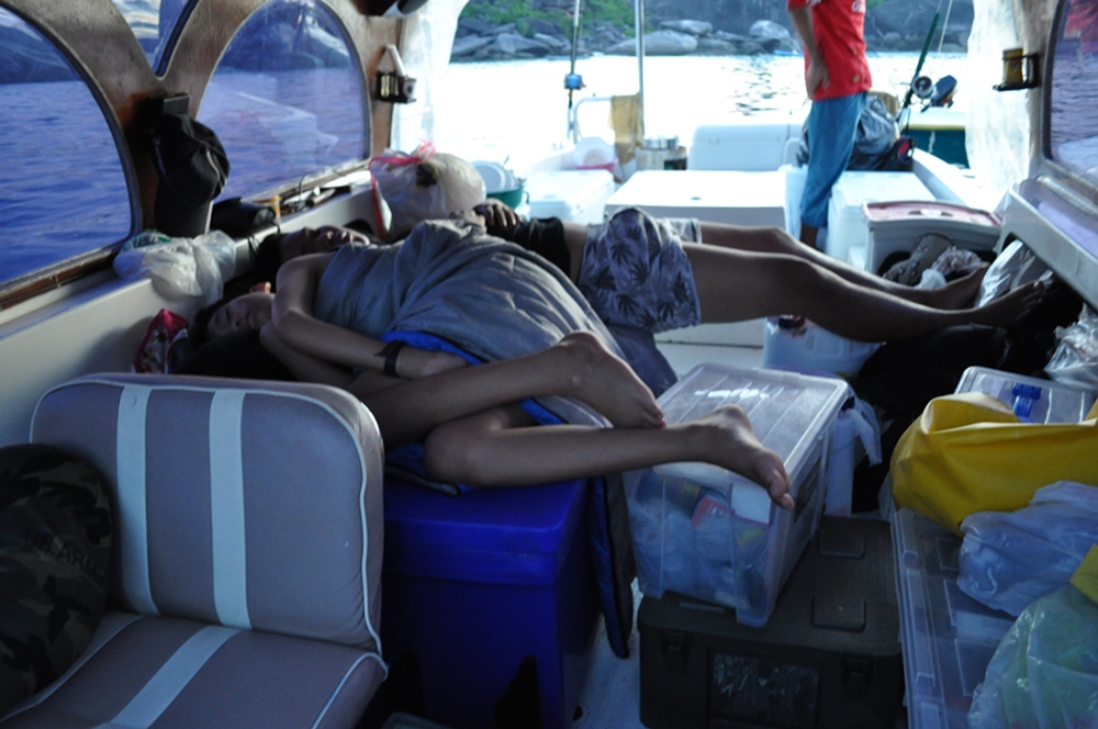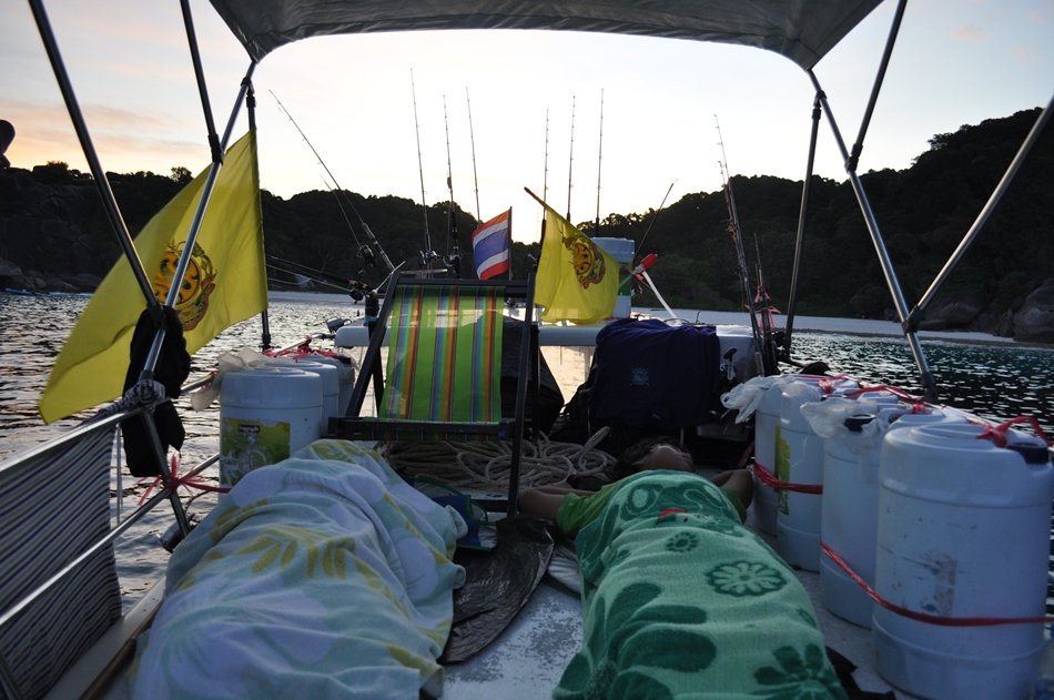 06.15น. วันที่12มี.ค.2555! วันที่ห้าของการเดินทาง james dondตื่นนอนเป็นคนแรกเช่นเคย! ลูกๆยังคงไม่ตื่น แต่มีการปรับทิศทางการนอนกันใหม่! โดยการนอนขวางถังน้ำแข็ง300ลิตร แล้วใช้กล่องเบ็ดและถังนัำมันเป็นที่รองเท้า!! ส่วนช่างโสก็เพิ่งไต่ลงมาจากหลังคาเรือ แล้วมายืนจับตรูด...บิดไปบิดมาอยู่ท้ายเรือ...ทำท่าคล้ายๆจะ...!!อิอิอิ!