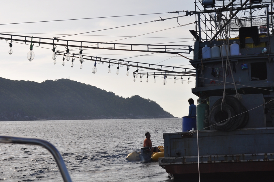 คืนนี้james dondวางแผนว่า...จะไปทดสอบหมายตกปลาที่ไต๋อ้วนได้ให้ไว้! จึงให้กัปตันเอกเช็คเหยื่อ ปรากฏว่าเหยื่อปลาหมึกและปลาทูแขก กัปตันเอกและช่างโสเอาไปตกปลาเมื่อคืนนี้...เหลือเพียงนิดหน่อย ส่วนปลาทูลังและปลาโอเราจะเก็บไว้เป็นเสบียง! พอเริ่มมืดก็เห็นเรือปั่นเริ่มติดเครื่องปั่นไฟกันแล้ว เราจึงตกลงกันว่า...พอกินข้าวเสร็จก็จะออกเรือไปหาเรือปั่น เพื่อขอพ่วงท้ายเรือเพื่อตกปลาหมึกเช่นเคย!