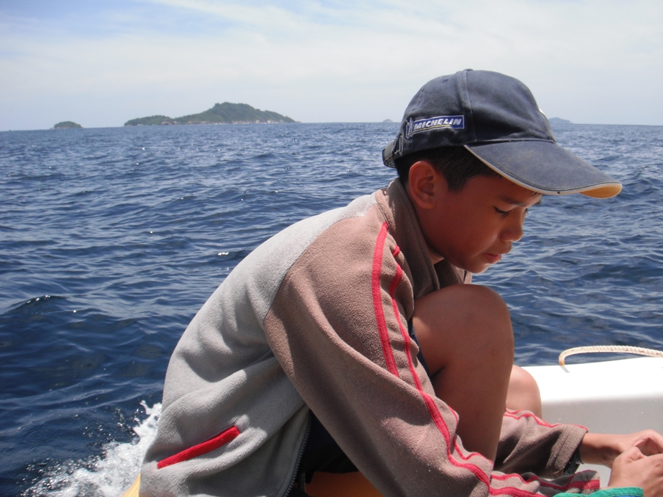 james dondและลูกๆ...ก็ลงน้ำตามช่างโสไปติดๆ สภาพน้ำวันนี้ใสพอประมาณ น้ำออกเป็นสีเขียวปนคราม อาจจะเป็นเพราะน้ำจืดจากบ่อพักน้ำบนเกาะ(เห็นตอนเดินผ่านขึ้นไปที่หินเรือใบ)...ที่ใหลซึมลงมาปะปนกับน้ำทะเลในอ่าว(สมัย20กว่าปีก่อนน้ำจะใสมากพอๆกับเกาะสี่) ส่วนฝูงปลาก็เยอะเหมือนๆเดิม มีลูกปลาหมึกหอมเกาะกลุ่มว่ายรวมกันเป็นฝูง ปลานกแก้ว(ตัวละ1-3กก.)มีให้เห็นเป็นจำนวนมาก! สภาพปะการังที่เสียหายจากคลื่นซึนามิเมื่อ7-8ปีที่แล้วกำลังเริ่มฟื้นตัว มีร่องร่อยอื่นๆที่อยู่ใต้น้ำอีกเช่น เครื่ิงยนต์เรือขนาดใหญ่และเศษซากไม้ที่จมอยู่ในอ่าว!...ก็เป็นฝีมือของคลื่นซึนามิอีกเช่นกัน!!