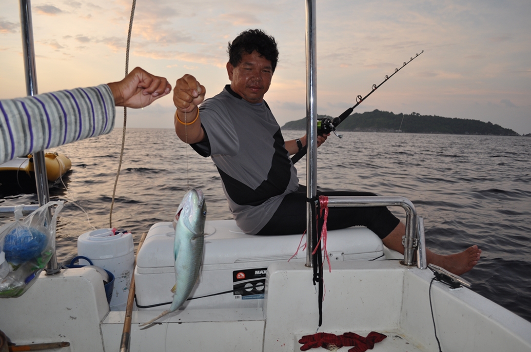 เราลงสายลากเหยื่อทรอลลิ่งอีก3สาย นี่คือการพยายามทำตามฝันอีกอย่างหนึ่ง เกมส์ตกปลาด้วยการลากเหยื่อทรอลลิ่งที่james dondห่างหาย...แต่ยังโหยหามากว่าสิบปี! แต่สุดท้ายก็ต้องฝากเหยื่อสองตัวไว้ที่ซั้งลูกหนึ่ง...ให้เป็นที่ระลึกแก่ทะเลอันดามัน!!