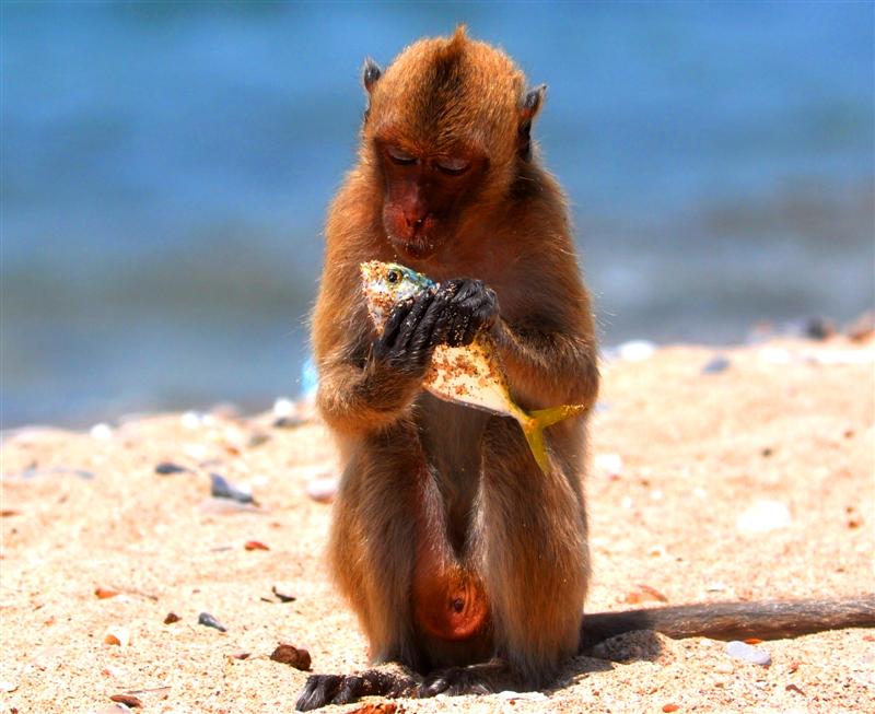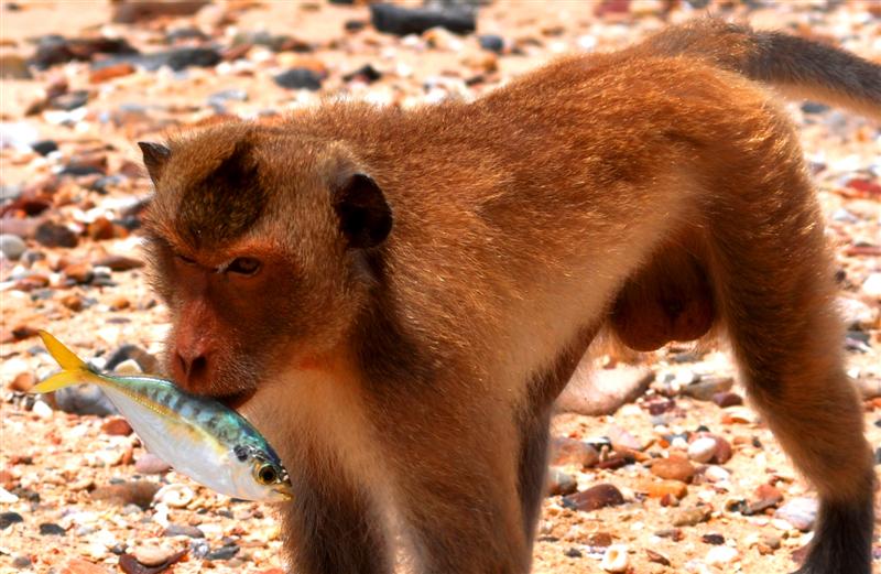 น้าวิจารณ์คัดเอาปลาตัวเล็กๆที่ตกได้มาแจกลิง