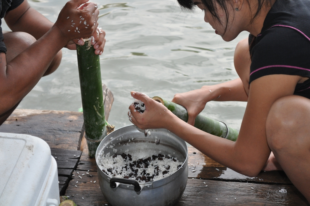 ข้าวเหนียวและถั่วดำ แช่น้ำไว้2-3ชั่วโมง กรอกใส่กระบอกไม้ไผ่!