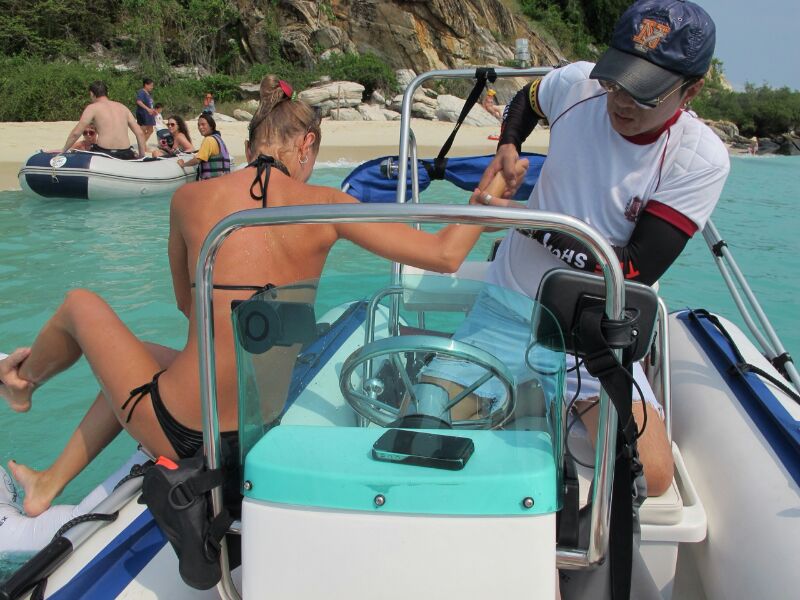 พอถึงเกาะปุ๊ป กำลังเอาเรือเข้าไปส่งลูกกับแฟน มีฝรั่งนุ่งบีกีนี่ปรี่เข้ามา แล้วก้อขอให้เราช่วยพาไปหาดตรงนู้นที อยากจะไปถ่ายรูปกับเพื่อนๆครับ