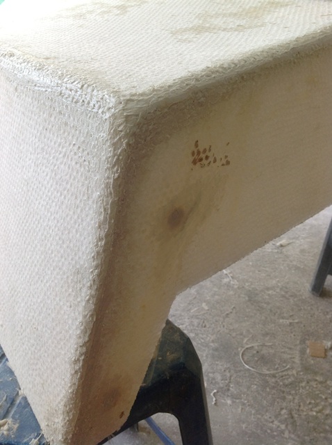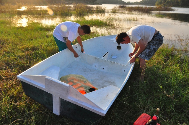 ผมอยากออกไปตามเกาะแก่งต่างๆ ครับ มอเตอร์ไกด์ที่ใช้ตกปลาคงใช้วิ่งยาวๆ ไม่ได้แล้ว ผมเลยหาเครื่องมือสองญี่ปุ่นมาติดครับ ตอนแรกว่าจะเอาซัก 5 แรงก็พอ จับพลัดจับผลู ได้ขนาด 8 แรงมาแทน น้ำหนักก็เพิ่มขึ้นอีกตามที่คาดเอาไว้ในตอนแรก ปัญหาต่อมาก็คือท้ายเรือที่เครื่องจะเกาะ ของเดิมมันเหมาะกับเครื่องแบบเพลาท่อนสั้น แต่เครื่องท่อนสั้นหายากเหลือเกิน พอได้ท่อนยาวมาผมก็ต้องเสริมท้ายขึ้นอีก 15 เซ็นติเมตร เพื่อให้บนสุดของใบจักรอยู่ใต้น้ำประมาณ 5-6 นิ้ว (เสริมโดยการหล่อเรซิ่นโดยที่สอดไส้ Honeycomb ไว้ตรงกลาง และเสริมความแข็งแรงด้วยใยแก้วที่เหลือจากโปรเจค)