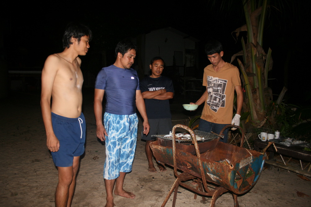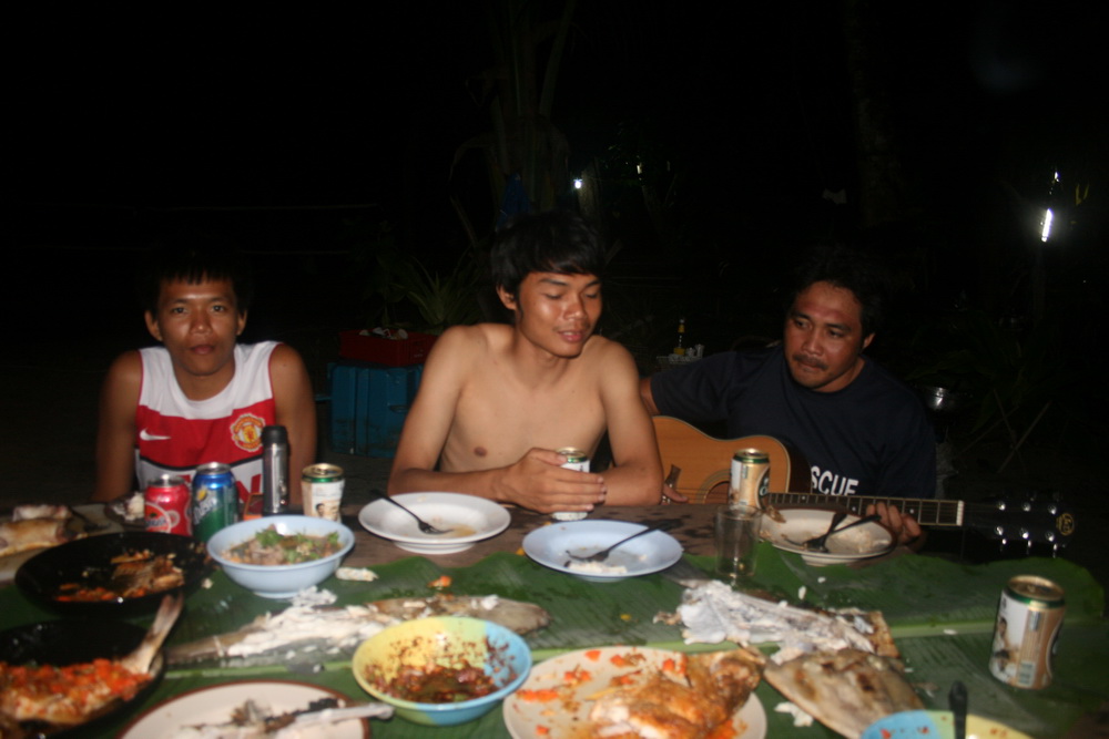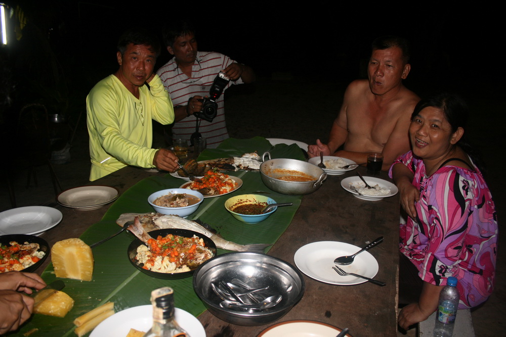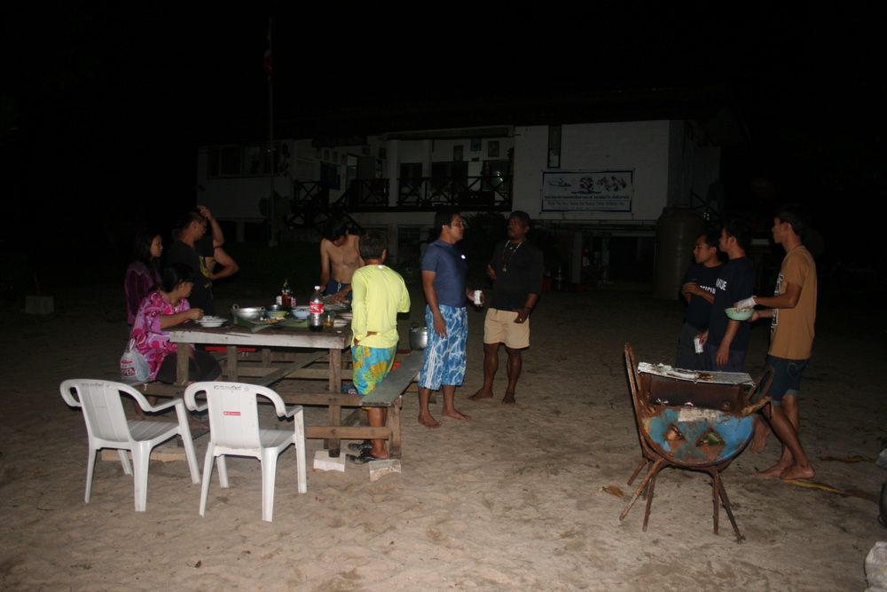มาว่ากันต่อน่ะครับ หลังจากพวกเรามาถึงเกาะสุรินทร์เกือบพลบค่ำ ได้ทักทายออกลีลากันพอสมควรก็มืดพอดี น้องๆ ทหารเรือ ก็จัดดินเนอร์แบบชาวเกาะต้อนรับคณะเราทันที บรรยากาศท่ามกลางแสงจันทร์ของคืนแรมหนึ่งค่ำ บนพื้นทรายที่นุ่มจนต้องถอดรองเท้าเดิน
