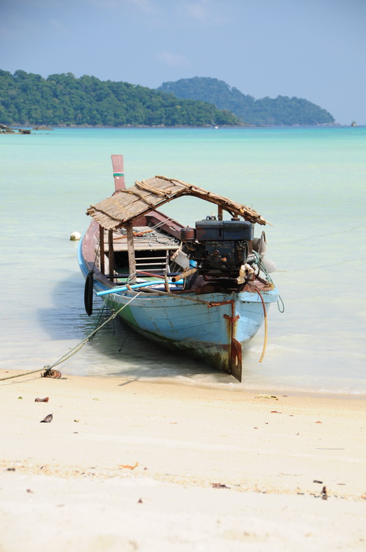เรือหางยาวสีฟ้าอ่อน กลืนกับสีน้ำทะเลสวยใส
