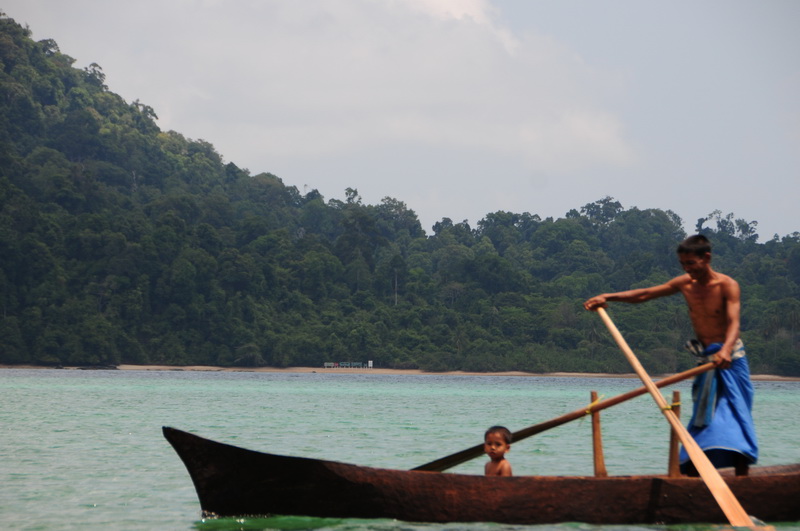 ภาพคนยืนพายเรือขุดที่พบเห็นได้แถวเกาะที่มีคนอาศัยแถบทะเลเมอกุย