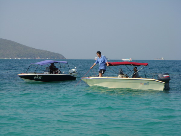 คำตอบที่ 36 ชัวร์ครับน้าจอร์ด แต่งเมื่อไหร่คงต้องรบกวนให้น้าจอร์ดช่วยเป็นเพื่อนเจ้าบ่าวสักหน่อย ว่าแต่....น้ามีเสื้อเกราะใส่หรือเปล่า สูทไม่ต้องใช้ อิอิ รูปนี้คู่น้าฐา น้ำทะเลแถวหมู่เกาะล้านนี่ยังใสพอได้นะครับ เรือ "จากคปาน" ที่อยู่ท้ายเรือน้าฐาแหละครับ ไต๋เรือยื่นหน้ามาถามผมว่า "จะเข้าฝั่งเมื่อไหร่" ถ้าจะกลับให้รีบกลับโดยเร็ว เพราะลมเริ่มลงมาแล้ว เดี๋ยวคลื่นจะโต แถมย้ำว่า "ไม่รอดแน่" แม้จะคลางแคลงใจอยู่บ้าง แต่ก็ไม่ดื้อครับ กลับกันเถอะเรา เสียดายเป็นที่สุดครับ