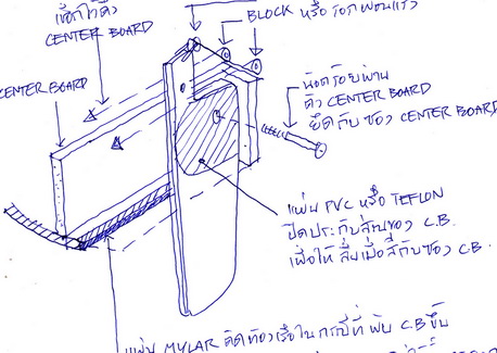 19. center boardหรือแผ่นงัดน้ำเพื่อกันเรือเคลื่อนไปด้านข้าง มีทั้งแบบยึดกับซองและกระดกพับเก็บได้แบบเรือ OK ,enterprise ,fireballและแบบเสียบเช่น เรือ laser