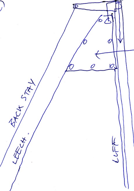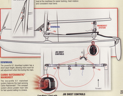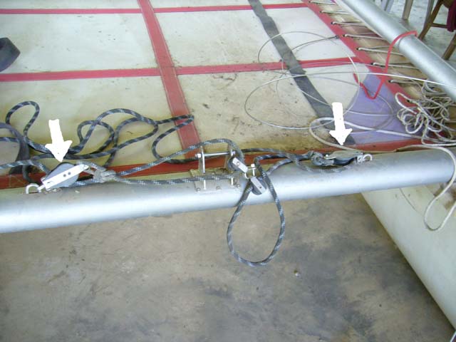 4. clew outhaul ท้ายใบสุด จะมีรูไว้ร้อยเชือกเพื่อปรับใบในส่วนท้านให้ตึงหรือหย่อน ช่วยในการปรับรูปใบให้เหมาะสมกับสภาพลมและแนวการเดินเรือ อาทิ ถ้า outhaul หย่อน ส่วนของใบด้านที่ทะแยง(leech) จะเกิดเป็นกระพุ้ง