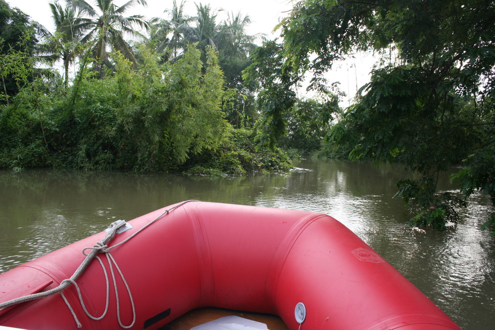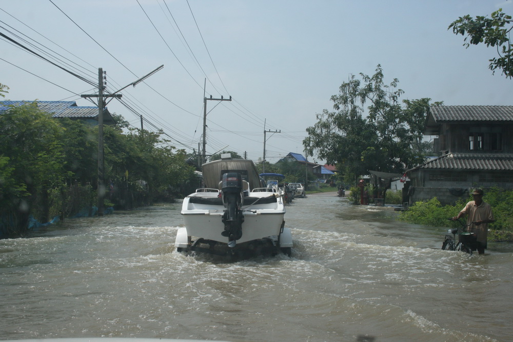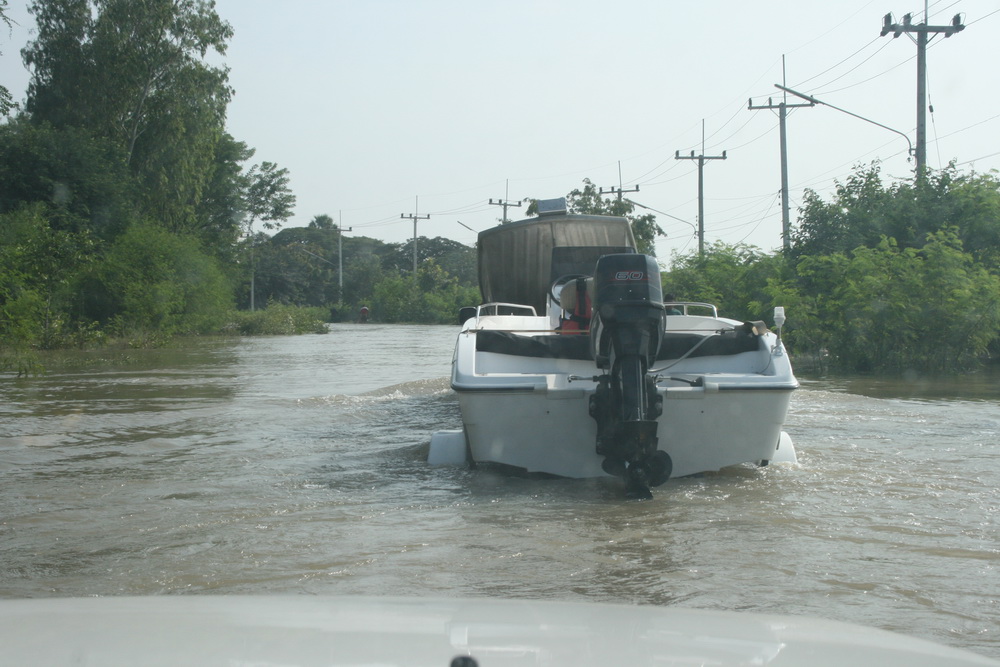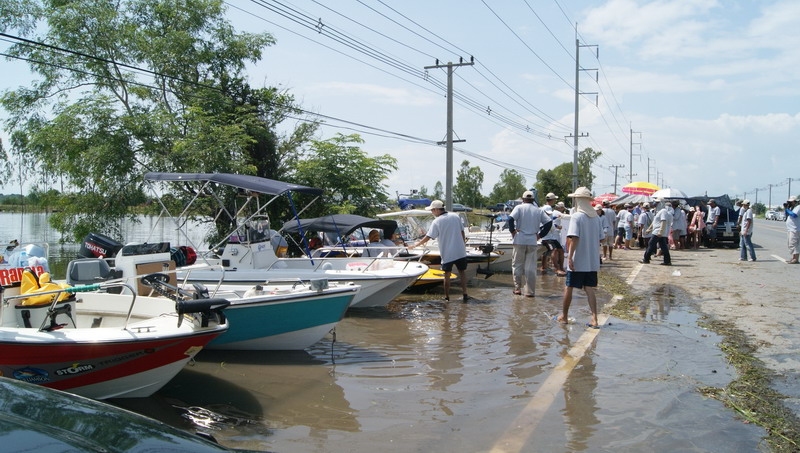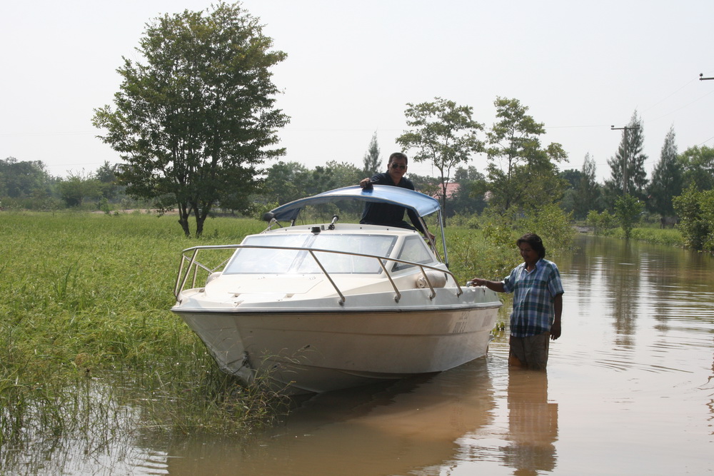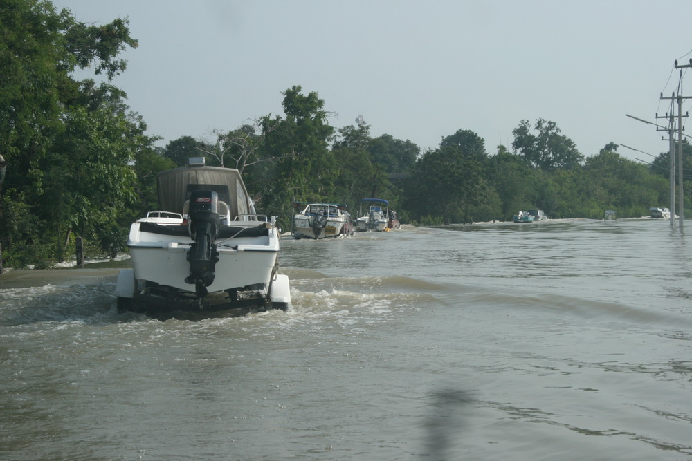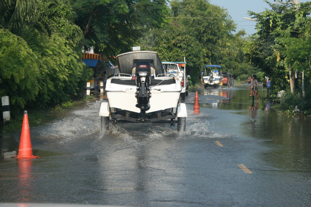 1.น้ำแรงสุดๆ ผมเร่งจนหมดขณะสวนน้ำเรือยังอยู่เฉยๆเลย แรงน้ำกับเครื่อง balance กันพอดี ต้องซิกแซกซ้ายทีขวาที ก็จะกระดึบได้ทีละหน่อยๆ มีน้ำมาตามซอยอีกทำให้เกิดน้ำวนอีกถ้าพลาดก็หมุนถอยหลังไปอีก 20-30 เมตร กว่าจะตั้งลำได้ เวลาตามน้ำ ก็ปล่อยลอยแบบล่องแก่งทั้งพายทั้งเครื่องต้อง ช่วยประคองให้เรืออยู่กลางซอยแคบๆ ไม่งั้นก็จะชนกับต้นไม้ เสาไฟ และ รั้วบ้าน บางบ้านก็เป็นรั้วลวดหนามอีก ขับเรือมานานไม่เคยเจอมันๆแบบนี้มาก่อนเลย ชั่วโมงแล้วชั่วโมงเล่า ที่ต้องทำแบบนี้จนถึงสองทุ่ม