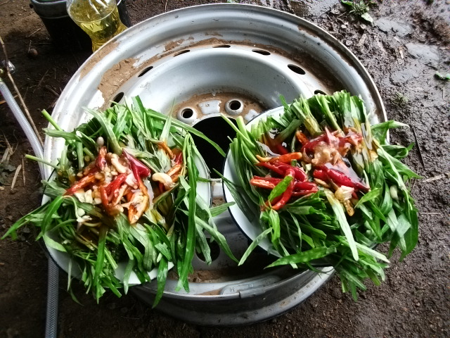ผัดผักบุ้งไฟแดงด้วย อร่อยหรือเปล่าไม่รู้เอามันส์เข้าว่า