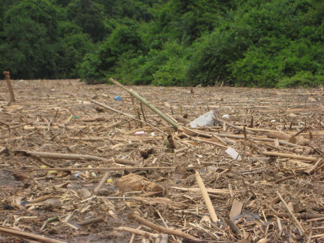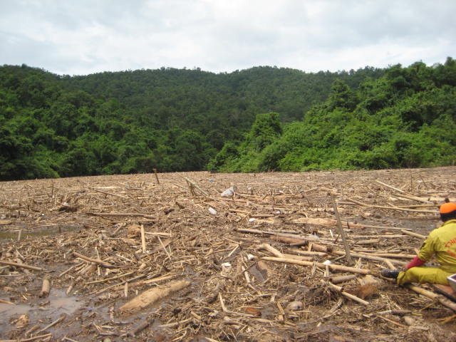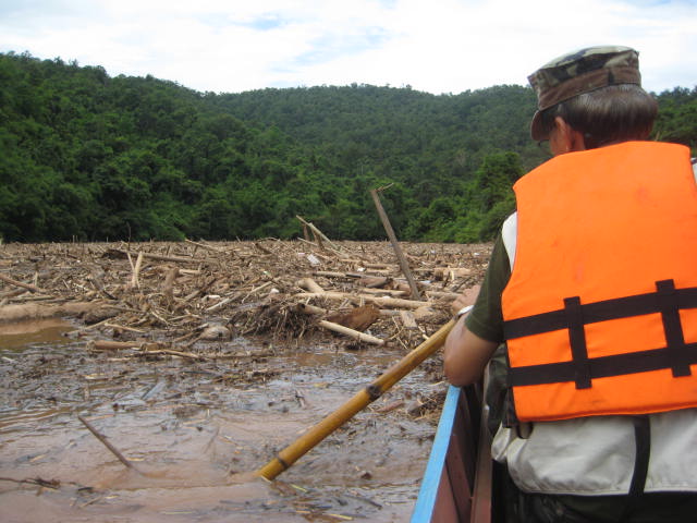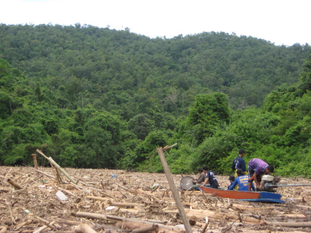 จนท.กู้ภัยพยายามลื้อสวะเข้าไปดู เข้าไปได้แต่ออกไม่ได้โดนเศษไม้บีบจนเรือเคลื่อนตัวไม่ได้