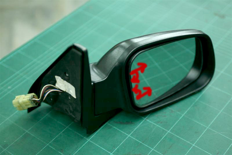 เริ่มจากดันกระจก ไปตามลูกศรสีแดง ตามภาพนะครับ ( ดันฝังกระจกด้านในที่ติดตัวรถนะครับ ) ดันแล้วจะรู้สึกว่ากระจกเคลื่อนไปประมา 2-3 mm. ออกแรงดันไว้ พร้อมออกแรงกดกระจกลง ถ้าหลุด ปลายด้านตรงข้ามจะกระดกขึ้นมา แค่นี้ก้อเอาออกมาได้แล้วครับ