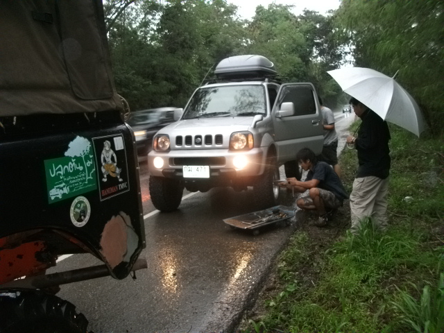 วันนี้คุณตู่ กฟผ.ขับจิมนี่มาจากกรุงเทพ มาเตรียมงานเวทีชาวบ้านเพื่อต้อนรับชาวบ้านนาน้ำซำที่จะไปดูงานปลูกป่าชุมชนที่ ต.ทุ่งลุยลาย อ.คอนสาร จ.ชัยภูมิ ฝนตกระหว่างทางน้ำหนาวจึงขับโฟร์ไฮ ปรากฏว่าเฟืองหน้าแดงเป็นไฟ ล้อล็อคทางลงน้ำหนาวเลยพาช่างไปถอดฟรีล็อคกับเพลาขับหน้าออกถึงที่หมายโดยสวัสดิภาพ